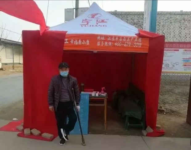 近日,一个遮阳棚改造的简易帐篷,在武强县孙庄乡张法台村东街口支了起来,这是脱贫户韩国辉送来的。他看到值守人员条件艰苦,特地买来了遮阳棚,做成简易帐篷,让大家值守的时候暖和一点。