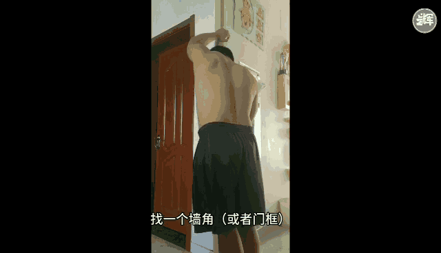 把手臂举高抓紧固定物(门框、墙角、柱子都可以),对侧腿向前小跨步,前侧腿屈、后侧腿伸展,把髋部向外送,深呼吸、感受背阔肌拉伸(可以保持动作的同时来回扭转躯干,会有强烈的拉伸感)。