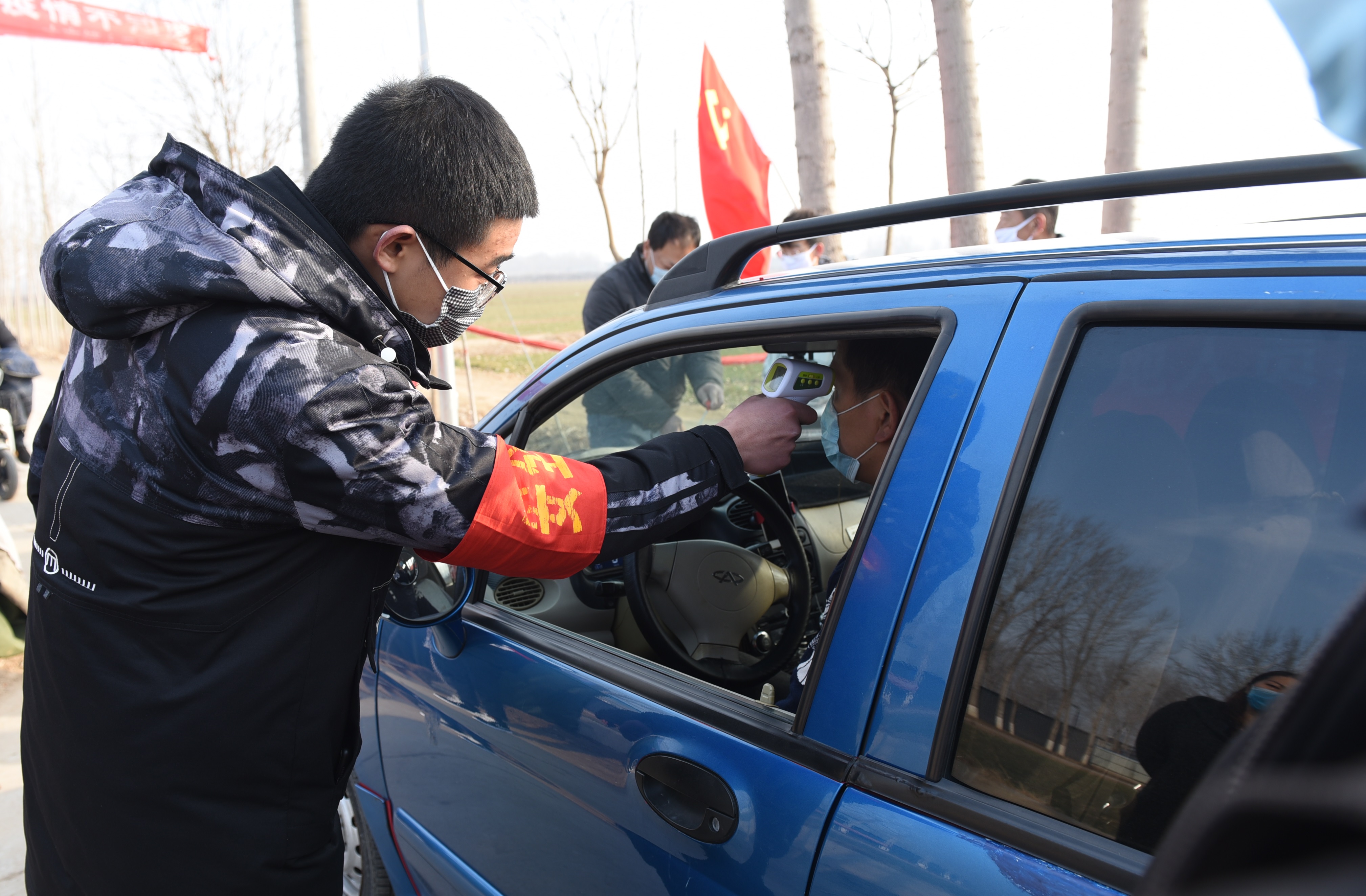 大屯镇潘家村大学生志愿者为过往车辆司乘人员测量体温。