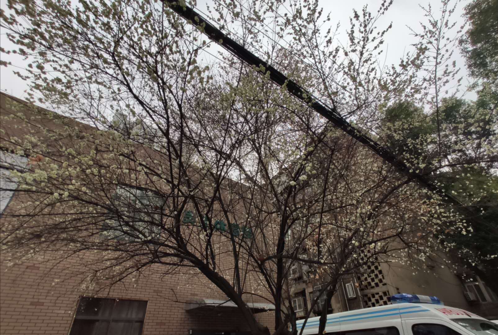 听她一桩一件慢慢讲述,时间不知不觉溜走了。道晚安的时候,谢爱静发来白天忙里偷闲拍下的照片。武汉市第七医院病房楼外,几树樱花悄然绽放。