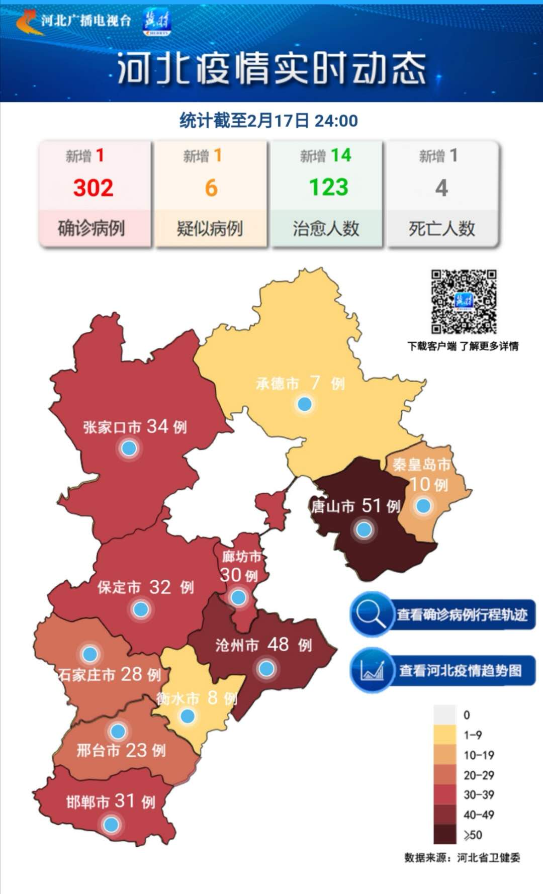 2020年2月17日0—24时,河北省报告新型冠状病毒肺炎新增确诊病例1例(沧州市)。新增治愈出院病例14例,其中,保定市5例、石家庄市4例、廊坊市2例、衡水市2例、唐山市1例。新增死亡病例1例(唐山市)。新增疑似病例1例(秦皇岛市)。截至2月17日24时,河北省累计报告确诊病例302例,其中死亡4例,现有重症病例21例,累计治愈出院123例。确诊病例中,唐山市51例、沧州市48例、张家口市34例、保定市32例、邯郸市31例、廊坊市30例、石家庄市28例、邢台市23例、秦皇岛市10例、衡水市8例、承德市7例;死亡病例中,沧州市2例、唐山市1例、邢台市1例;重症病例中,沧州市4例、石家庄市3例、秦皇岛市3例、唐山市3例、廊坊市2例、邯郸市2例、张家口市1例、保定市1例、衡水市1例、邢台市1例;出院病例中,保定市26例、沧州市18例、廊坊市16例、石家庄市11例、唐山市10例、邢台市10例、邯郸市10例、张家口市9例、衡水市6例、承德市4例、秦皇岛市3例。现有疑似病例6例。目前累计追踪到密切接触者10472人,当日解除隔离医学观察578人,现有2358人正在接受隔离医学观察。