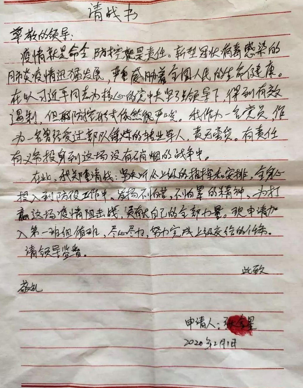 2月1日,景县行政拘留所按上级要求转入战时勤务模式。 面对新冠肺炎疫情防控工作的严峻形势,张金星向单位隐瞒了父亲病重卧床的消息,主动请缨要求值第一班岗,并递上请战书。“所长,我是党员,大“疫”面前,我先上!”他说。