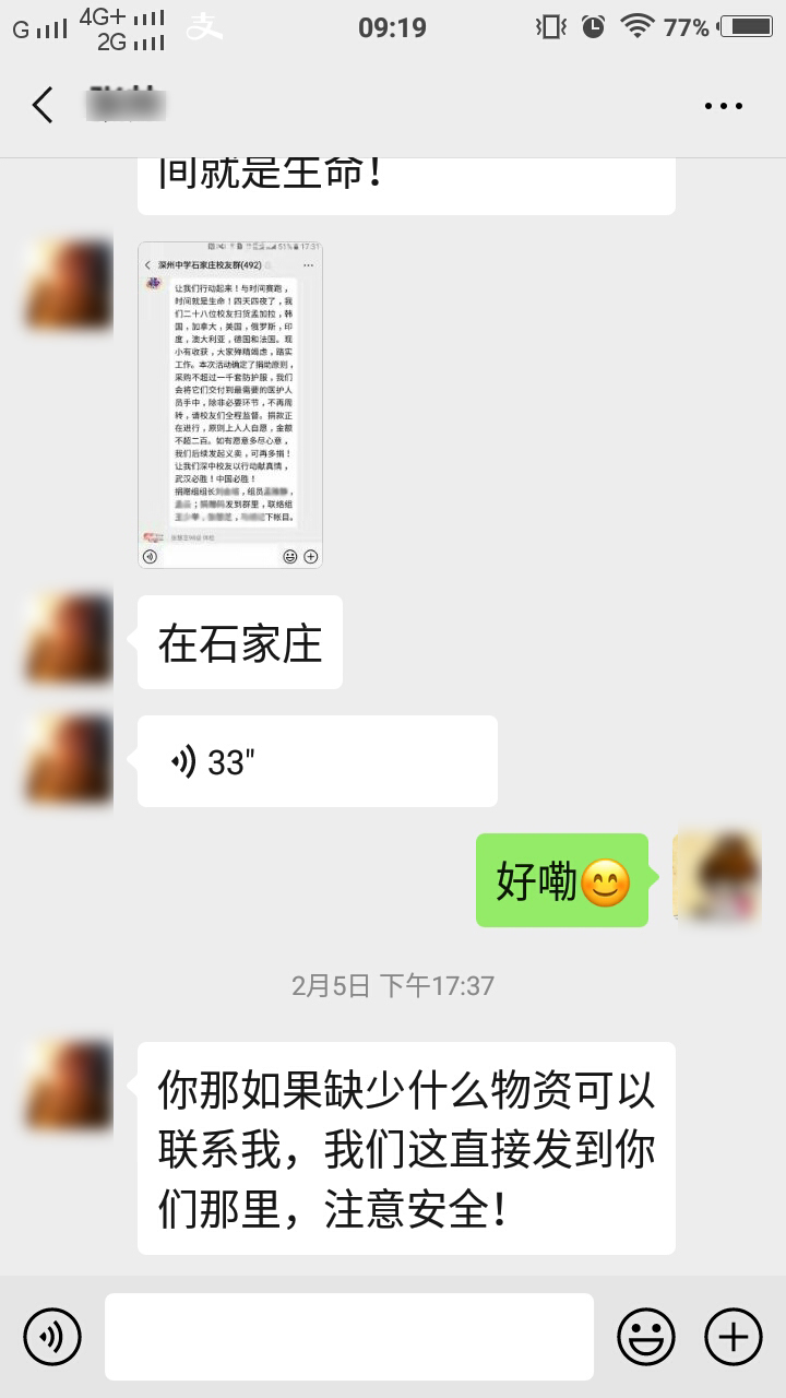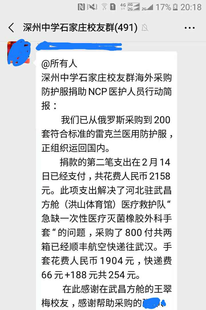初中同学张小爱(化名)通过别人的朋友圈看到了我在抗疫一线的消息后,第一时间和我取得联系,加上微信好友并把我拉进“深州中学石家庄校友群”。作为“娘家人”,校友们都非常关心我在武汉的生活和工作,表示愿意出钱出力、竭尽所能,为武汉抗击疫情贡献绵薄之力。