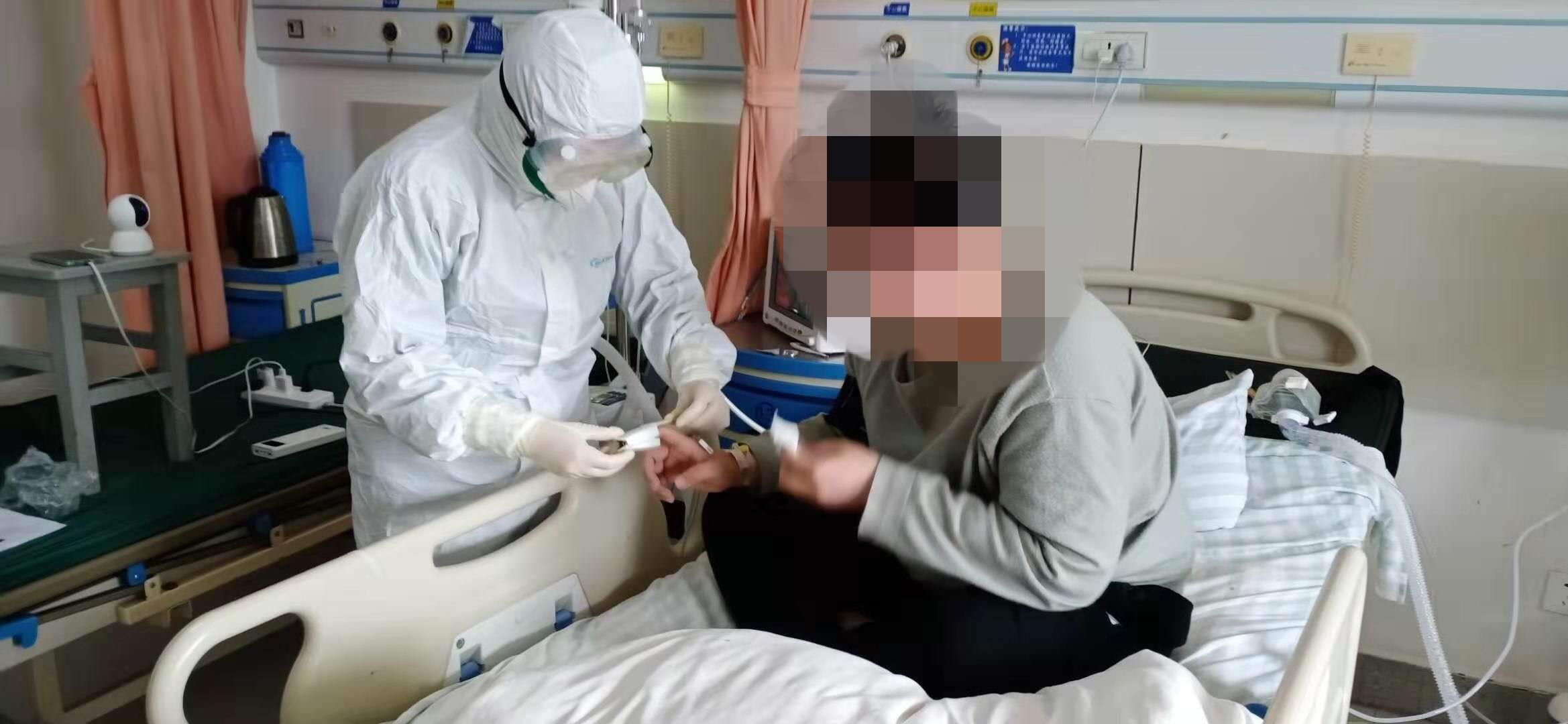 一般情况下,病人都是自主呼吸空气,如果失去自主呼吸的能力就会给病人上鼻导管吸氧,鼻导管吸氧还不行就会用氧气面罩吸氧,再不行就用无创的吸气,比如高流量吸氧,以及无创呼吸机……还记得刚去接这名患者时,由于受病毒感染比较严重,他只能始终保持半卧位姿势才能正常呼吸,心率达每分钟120次左右,呼吸35~40次每分钟,在吸氧的状态下指脉氧波动在70%—89%之间。稍微一活动患者就咳嗽不停,随之的生命体征特别不乐观!当时到患者及家属那种无助又带有强烈期盼的眼神,我心里就像针扎一样。在重症监护室,看着满身管子的他,我们也不断为他打气加油,你这么年轻,一定要坚强!我们会守护你!