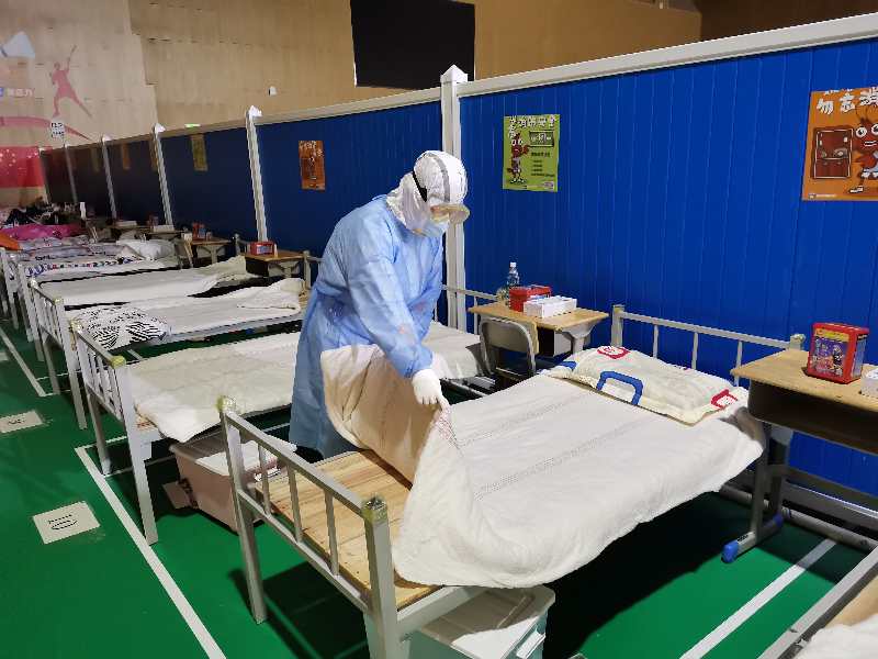 提前一个半小时出发和队员们来到武昌方舱医院,换好防护用品进入病房,交接完毕,就开始了日常的护理工作。我们不仅负责患者的基础护理、心理护理,还包括生活护理,给患者送饭、送水,处理生活垃圾,帮助他们解决生活需求。
