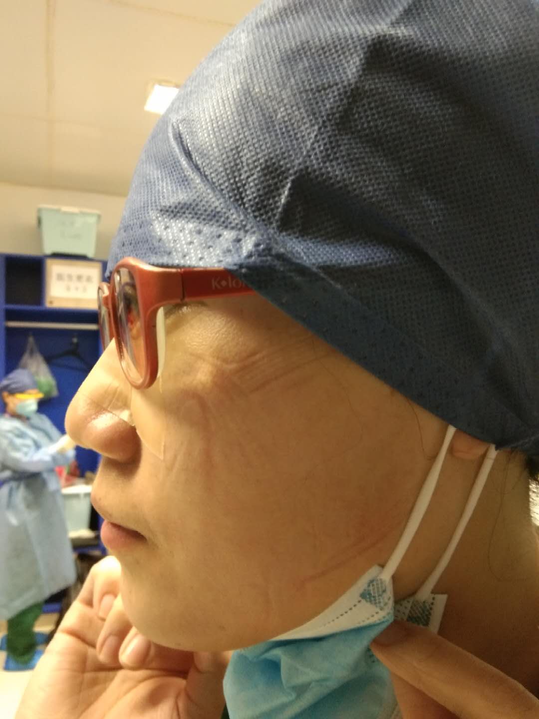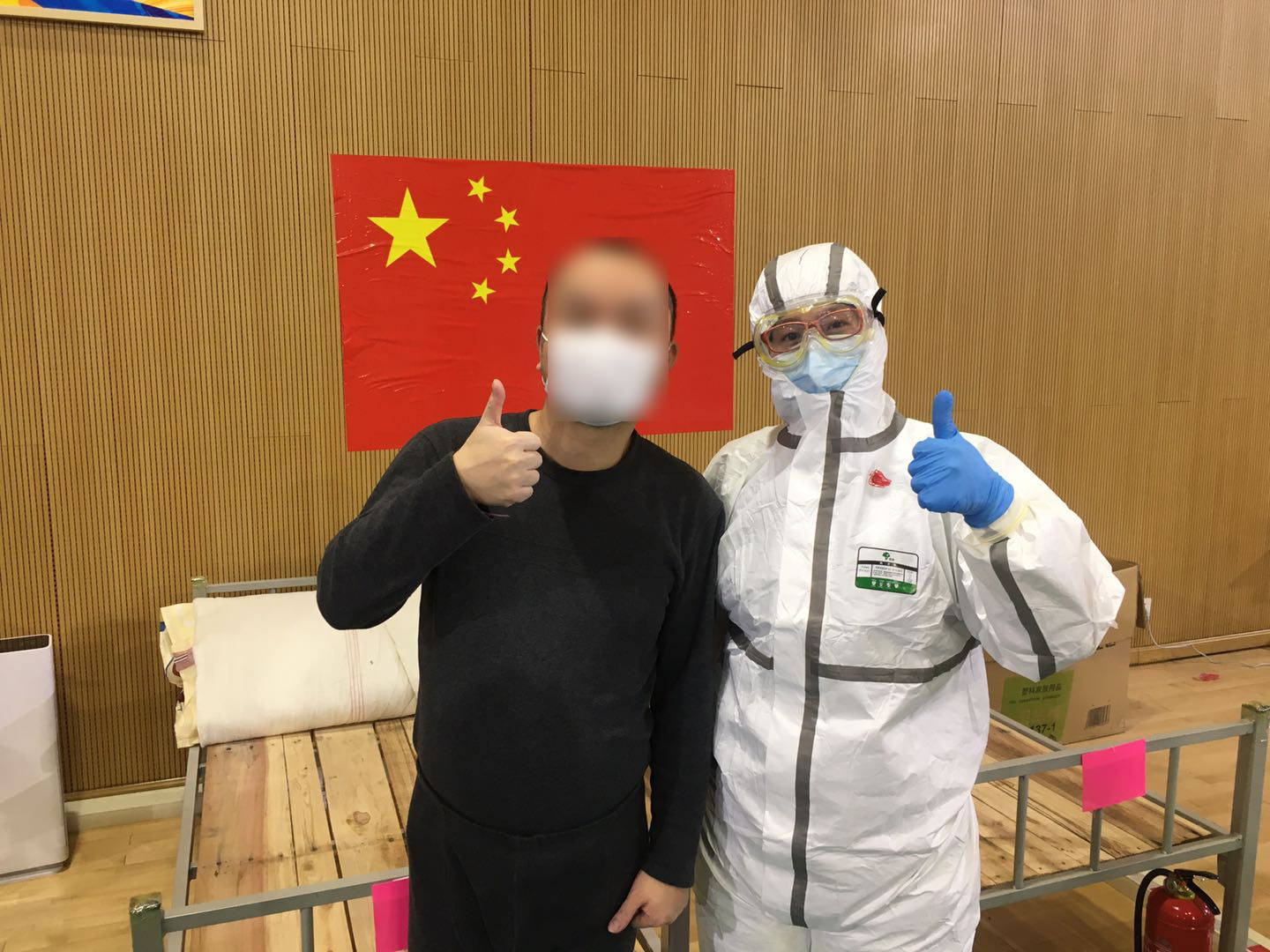 工作中,患者都非常配合,我们抽血、测血氧、登记体温等操作后他们都会说谢谢。今天值班时很多病人都睡了,灯都调的特别暗,再加上护目镜里雾气蒙蒙看个床头卡很费劲,没睡的患者见我在那儿看床头卡,就主动打开自己的手电筒帮我照着。