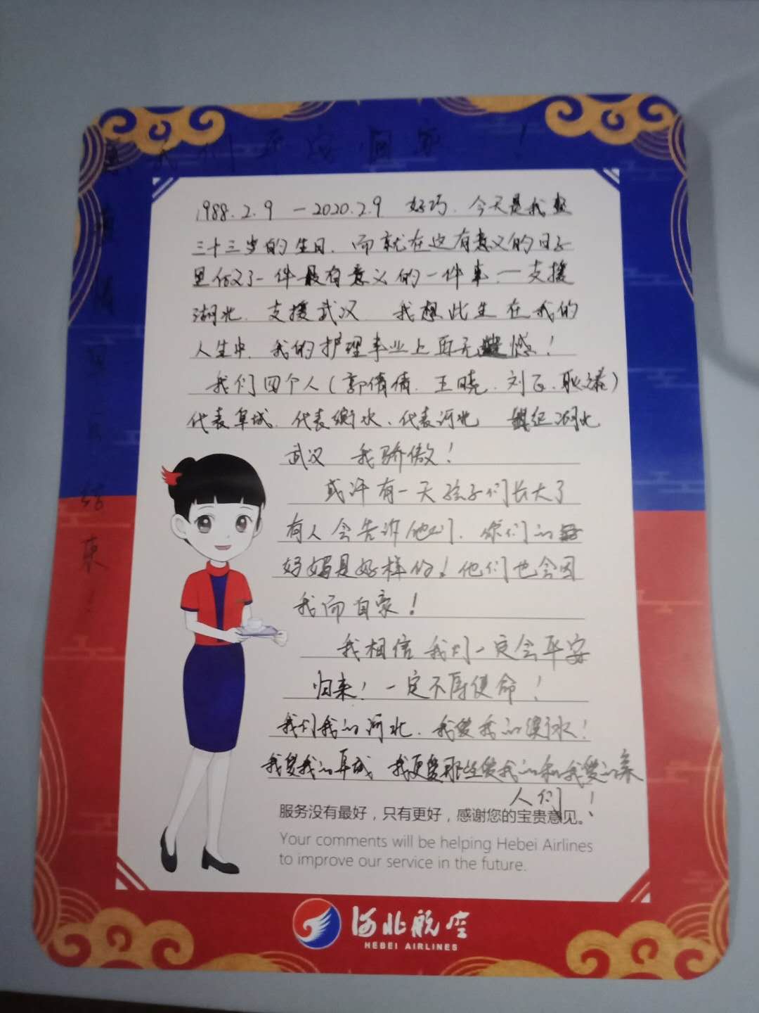 出发那天2月9日,恰好是我33岁的生日,因为时间紧急,来不及和同事朋友一一告别,我们踏上了南下的征途,县委书记给我们送行,并寄语了家乡父老的殷殷嘱托,更让我觉得责任艰巨、使命光荣。在河北航空公司的便笺纸上,我写下了一段话“支援武汉是我做过的最有意义的一件事,完成这件事,我想在我的事业上就没有遗憾了,不敢和孩子告别,怕情绪控制不住,但是将来我可以告诉他们妈妈今天的作为,他们一定会为我自豪,我相信我们一定会不辱使命,平安归来”。
