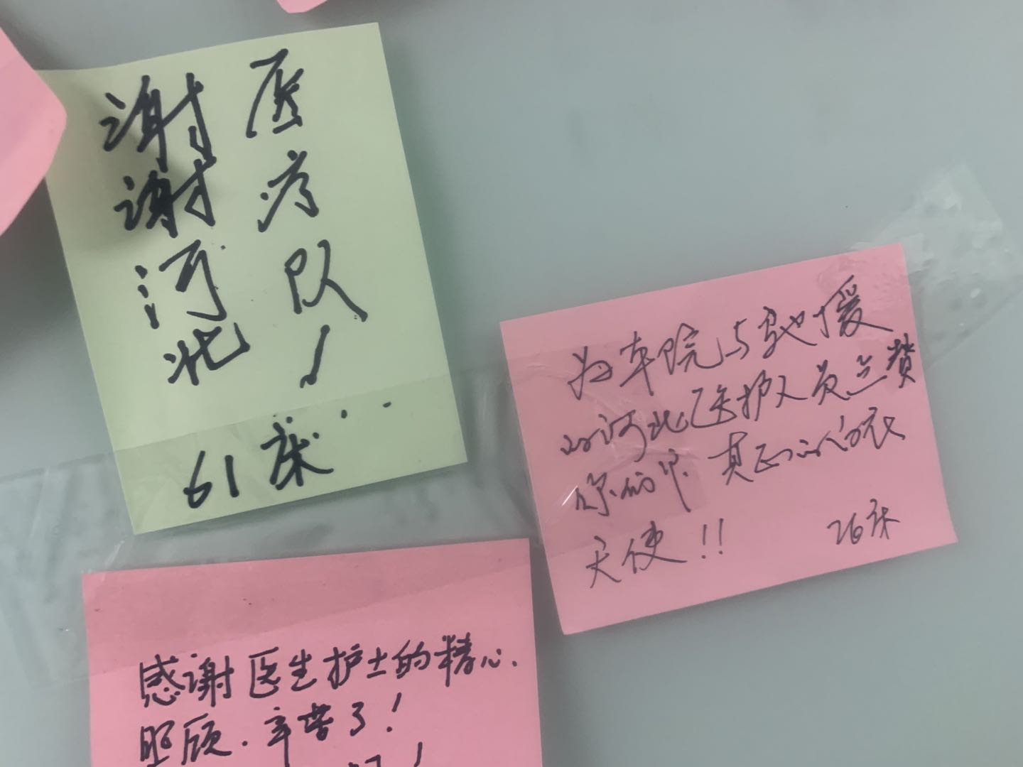 齐娜说,她最喜欢看的就是病区那面特殊的“留言墙”,墙上密密麻麻地贴满了五颜六色的暖心卡片,卡片上是患者们手写给医护人员的感恩和祝福:“非常感谢河北的医护队员,他们像亲人一样地照顾我们。我们的病一半是他们的亲和力治好的。深深地感谢!”“感谢医生护士的精心照顾,你们辛苦了!”“为本院与驰援的河北医护人员点赞,你们是真正的白衣天使。”每次看到这些暖心的卡片,齐娜的心中都会充满无限的力量。她说,这些卡片的背后,是他们与患者之间逐渐建立的深厚感情。其实,像这样医患情深的故事每天都在武汉上演。
