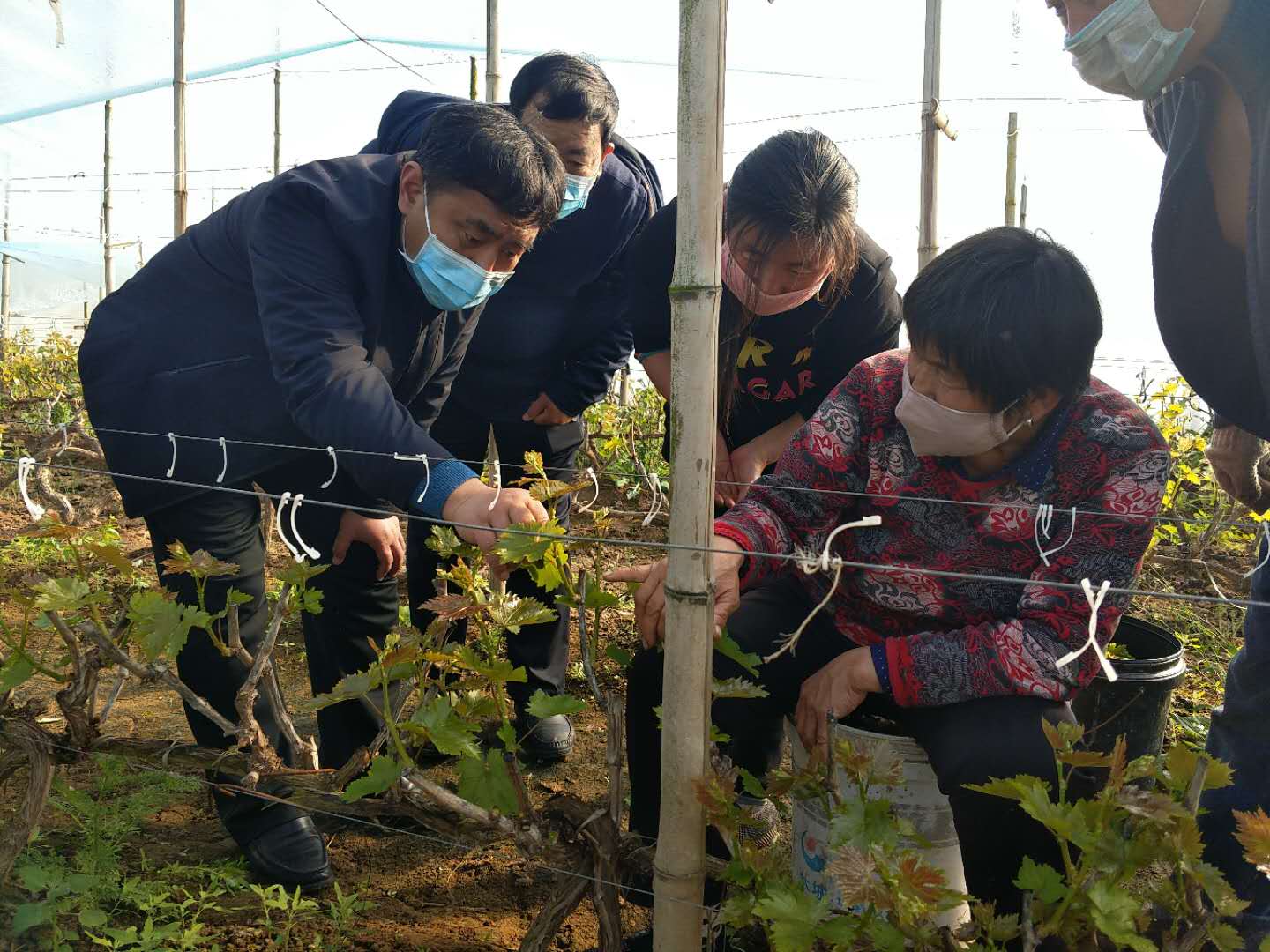 2月22日,阜城县蒋坊乡来海葡萄种植合作社内,一个个整齐排列的大棚在阳光照射下,随风起伏、银光闪闪。棚内葡萄长势喜人,枝条已有五六寸长。几名戴着口罩的妇女正忙碌着掰叉整枝。