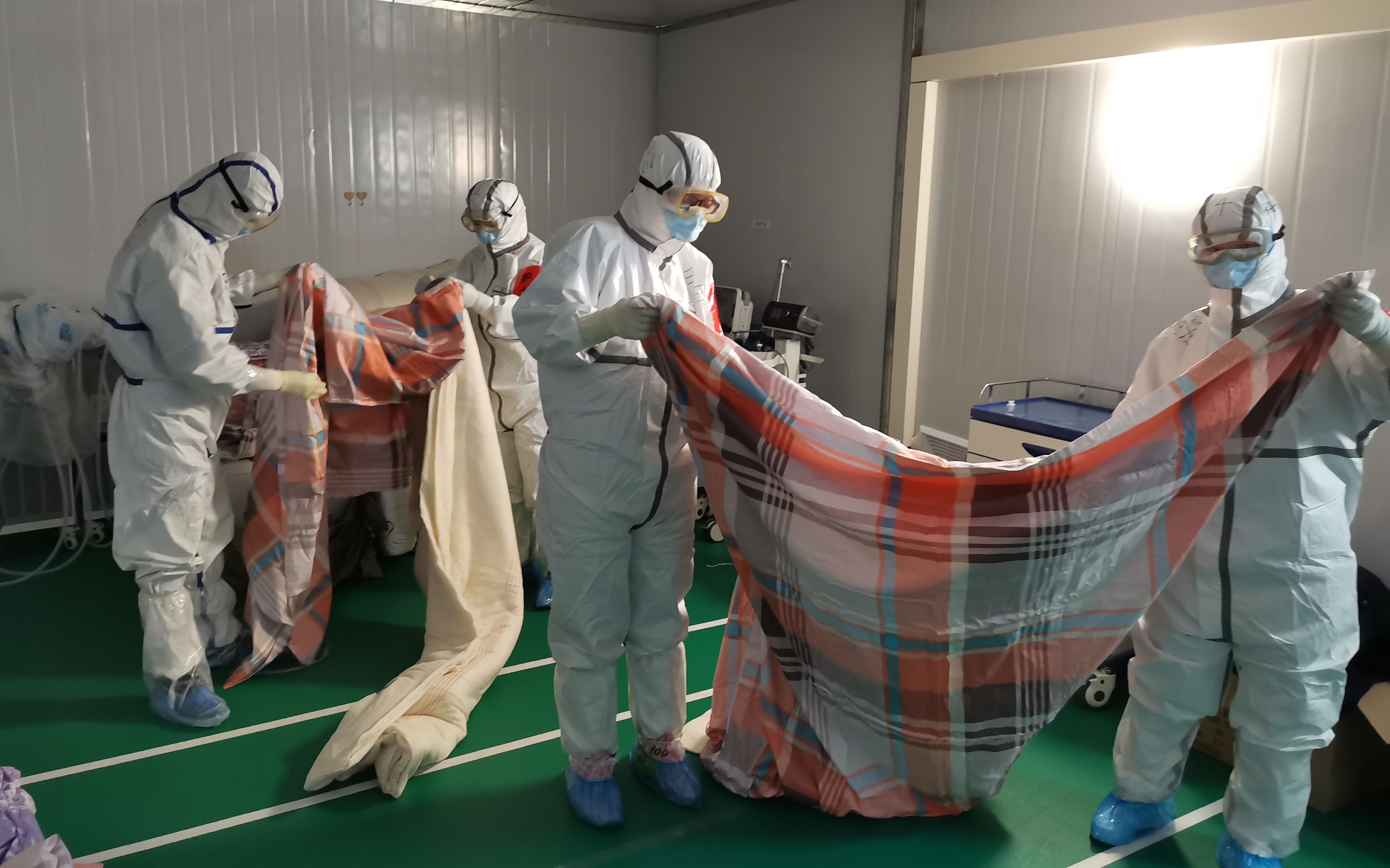 我们医疗队最关注的问题还是患者的生命健康和安全。安抚患者情绪,为患者做例行的检查,日常分餐,打扫卫生,清理出院患者床铺用品,舱内消杀,指导患者掌握消防常识、个人卫生注意事项……尽管透过眼镜、护目镜这些屏障做起这些工作比往常要吃力,但我们每个人都在坚持,坚持把每一个环节做到更好,因为我们知道,每一个环节的疏忽,都可能给患者安全带来威胁,每一个环节都和患者的生命牵连在一起。