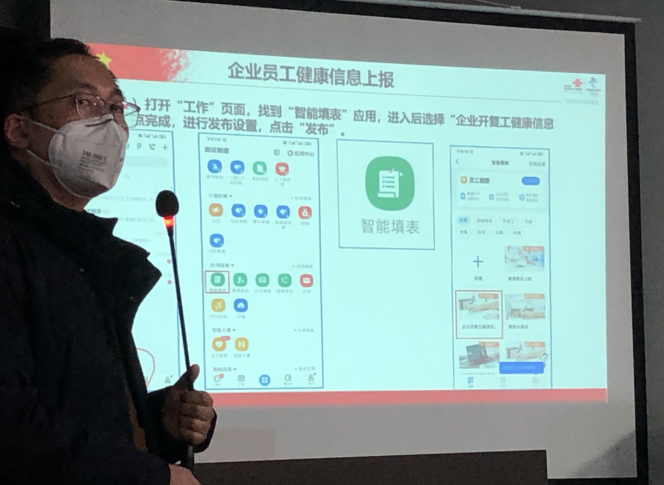 提前部署,周密布防。召开全体人员企业复产复工工作培训推进会,并指导复工企业使用“钉钉”软件对全体工作人员节后返岗复工情况进行了摸底汇总,并严格按照时间节点进行日报告,同时自觉填写入户排查登记表及企业复工员工去向互动登记表,合力做好防控工作。