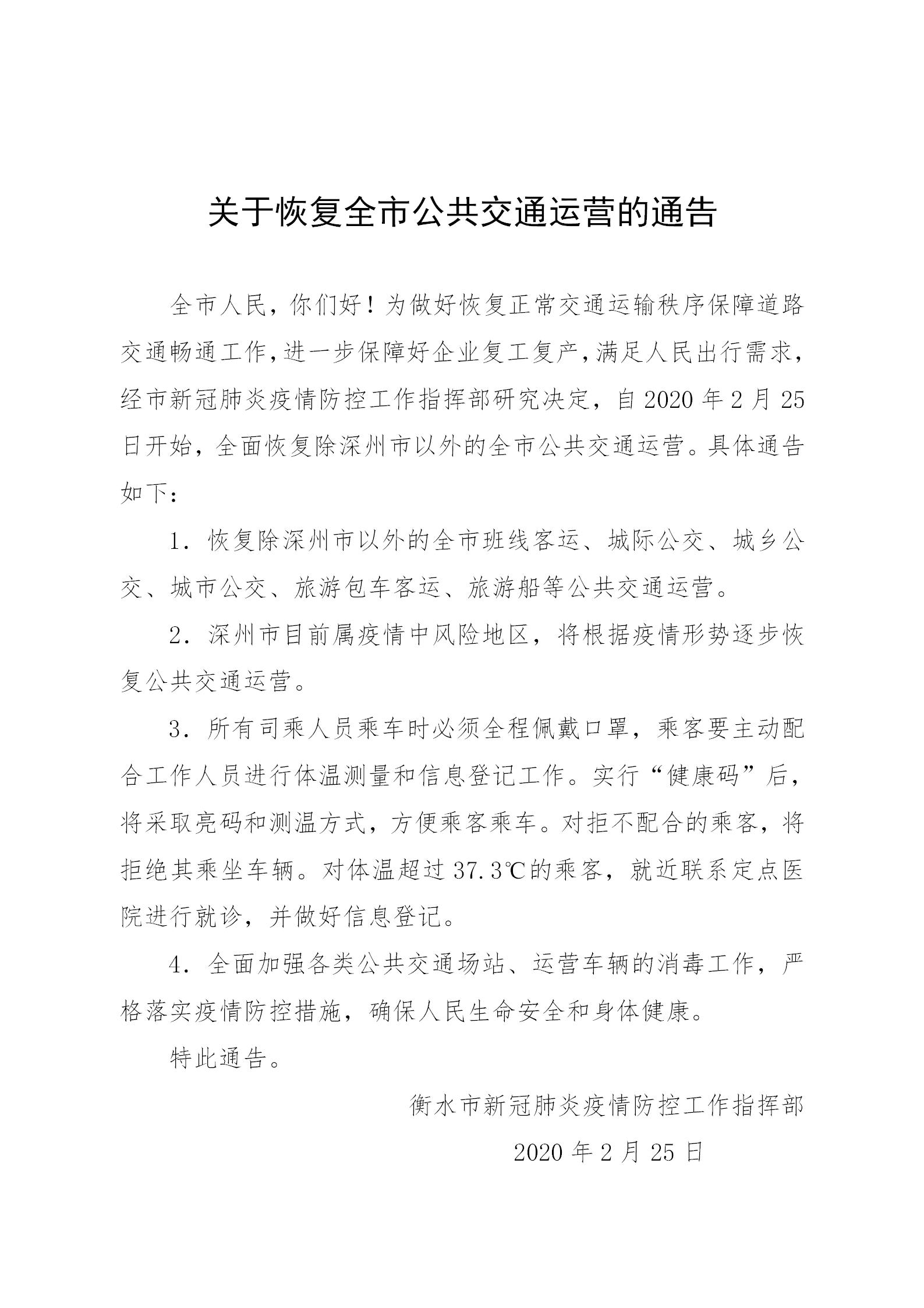 全市人民,你们好!为做好恢复正常交通运输秩序保障道路交通畅通工作,进一步保障好企业复工复产,满足人民出行需求,经市新冠肺炎疫情防控工作指挥部研究决定,自2020年2月25日开始,全面恢复除深州市以外的全市公共交通运营。具体通告如下: