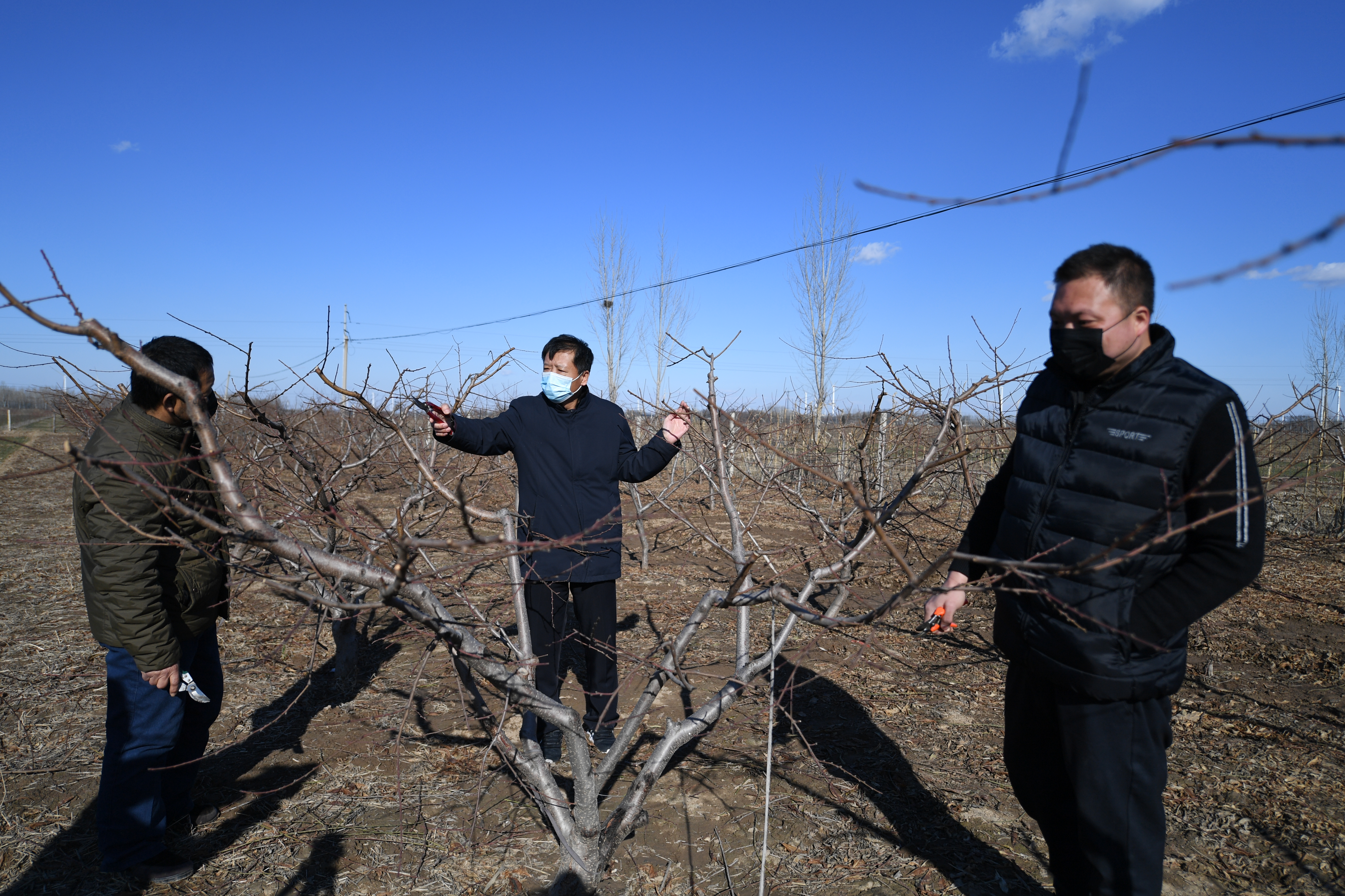 有了专家的科学指导,村民们戴上口罩,间隔开距离,在桃园里忙碌起来,浇水、剪枝、梳枝……“俺们干活不忘防疫,每天出村登记、测温,回村测温、消毒,一样儿也不落。”贫困户薛义明边剪枝边说。