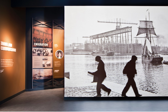 进入博物馆,首先映入眼帘的是贝尔法斯特和当地造船业的发展史,墙上的屏幕用黑白默片演绎了贝尔法斯特100年前的美好时光。馆内最特别的体验项目是“造船厂云霄飞车”,游客坐上6人一辆的“云霄飞车”,可以在黑暗中体验二十世纪初期造船厂里的真实场景,优雅的音符从唱片中悠悠传出,录像机放映着当年人们的日常生活和艰苦工作,画面十分逼真。