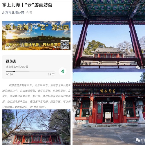 在北京市北海公园的公众号上点击“掌上北海”,不但可以按照四季欣赏北海公园的美景,还可以了解诸如折粮石、遮荫侯、铁影壁等北海文化瑰宝的传说和典故。现在,“掌上北海”还推出了“云游”系列,图片、文字加上语音导览,一期一个地点。比起走马观花,这样“逛”可算是“深度游”了。