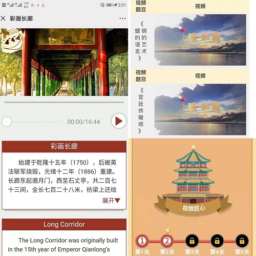 滑动地图选择区域、选择经典景点、听语音讲解……颐和园的“云逛”模式十分细致成熟,让人宅家也能身临其境,除了可以观看《妙趣横生的七巧桌》《透风的墙》《宫廷供暖师》《皇家戏楼的声学奥秘》等多部视频,还能玩游戏闯关。先在线“溜达”,等到疫情结束再“实地考察”,相信会比别人更加“值回票价”。