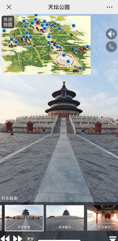 “云逛”天坛,可以选择“全景漫游”,点击画面中的箭头,就可以“走”到下一个景点:祈年殿、丹陛桥、长廊、七星石、九龙柏……公园内所有的景点全部包含在内,各个地点都可以随意放大缩小并360度全景观看,还伴有语音介绍。只要动动手指,就能完成一次不出门的“春游”。