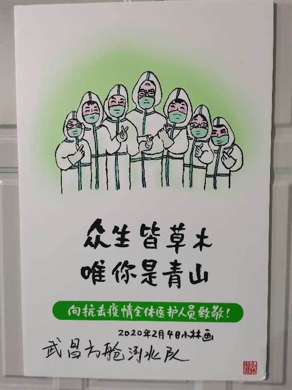 新冠肺炎疫情的蔓延,让太多的人产生了焦虑、恐慌情绪,无论对患者、医护人员还是寻常百姓,“心理防疫”至关重要。而小林漫画优雅、诙谐、经典、前卫、质朴、时尚,可以让人笑喷,而且老少皆宜,又像家常便饭易于接受。河北医疗队邀请小林漫画的作者专门绘制了100多幅励志漫画,被医疗队员张贴在驻地、通勤班车以及方舱医院病区内,这些漫画可以让人捧腹、也可以激励人们前行,减轻患者心理压力,缓解医务人员的疲惫!