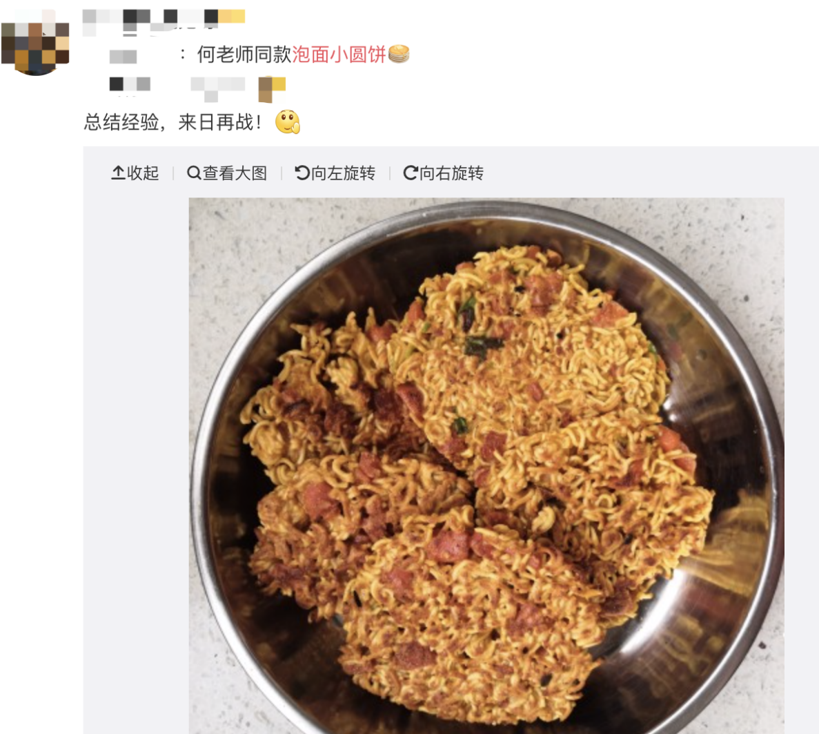 著名主持人何炅近期发布了泡面小圆饼教程,不少网友纷纷效仿,做法其实并不难,将泡面捏碎放入碎火腿肠,打入两颗鸡蛋,加入泡面调料并搅拌均匀,放入平底锅压平整,可做成小圆饼,也可整个一大饼煎至两面金黄出锅即可。煎好的泡面饼酥脆可口,别有一番风味。