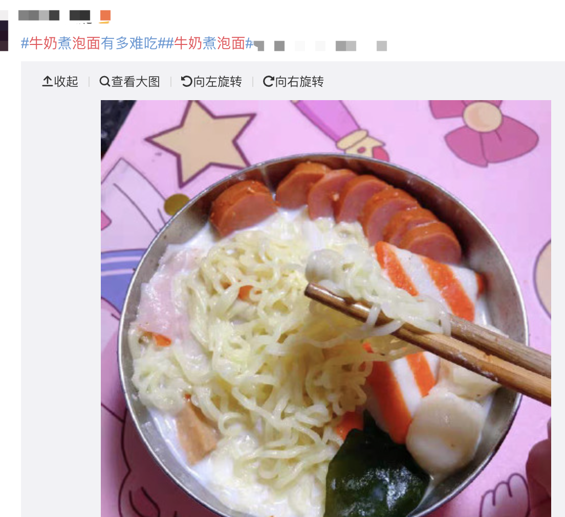 牛奶泡面,听起来似乎不能想象,但混搭风往往会呈现不一样的效果。一包牛奶、一份泡面,直接开煮,中途适量加一点水,还可以加入青菜、火腿等食材。做好的牛奶泡面奶香四溢,口感嘛,有网友表示很可口,也有网友表示并不好吃。不过,个人口味不同,到底好吃不好吃,感兴趣的小伙伴可以亲测感受一下!