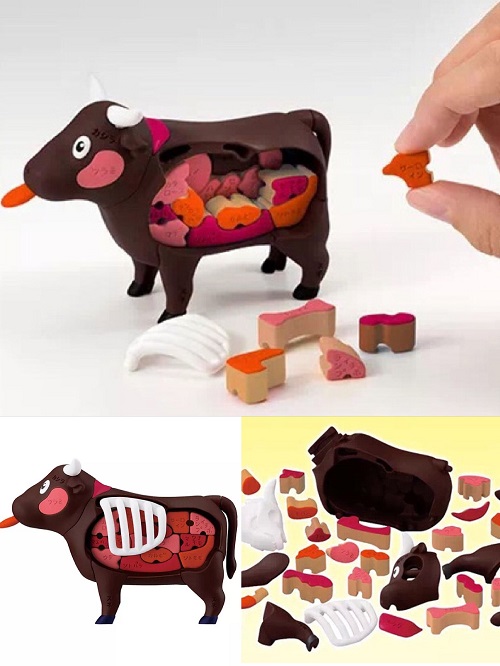 拼图没什么新鲜的,但是又萌又精致又“有点好吃”的拼图你见过吗?MegaHouse就将一头牛分解成37个零部件,而且还都是烤牛肉的各个部位,可以分拆可以组装,完全就是玩具版的“庖丁解牛”,肉块的部件还能随着人触摸的温度变色。