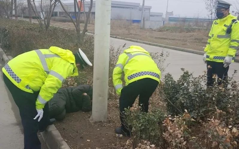 当日14时30分许,故城交警大队袁爱民、鲁立强、孔垂梦、张新林四位执勤民警,巡逻至邢德线衡德开发区路段时,突然发现道路北侧绿化带里躺着一个人,小腿伸到机动车道上,情况非常危险。