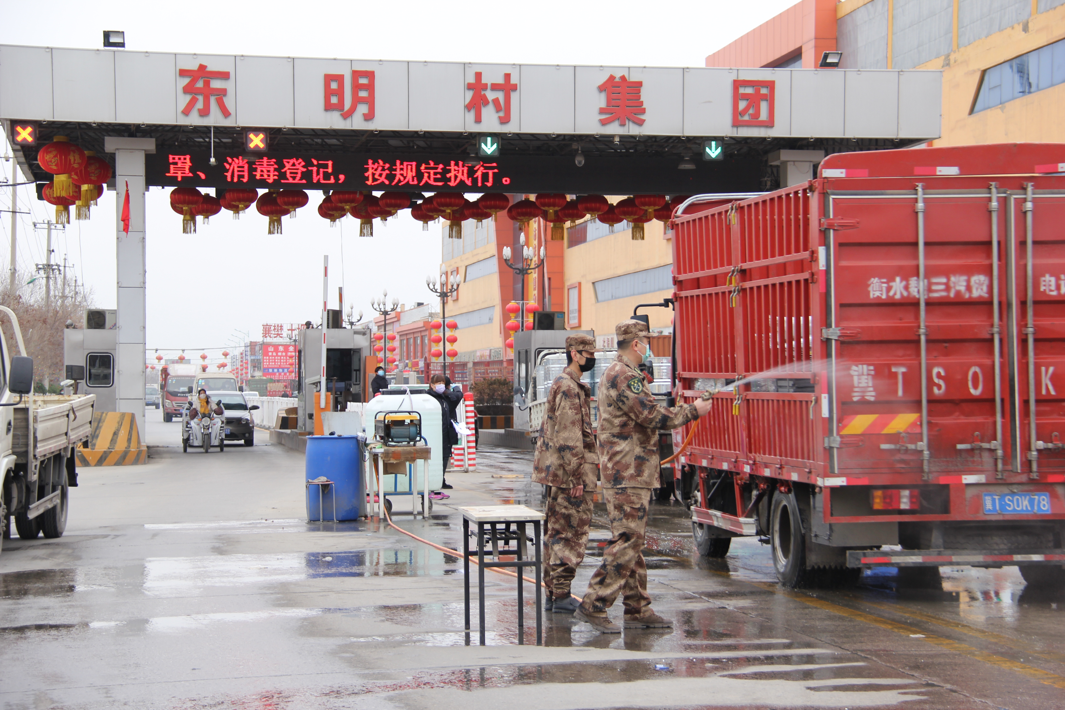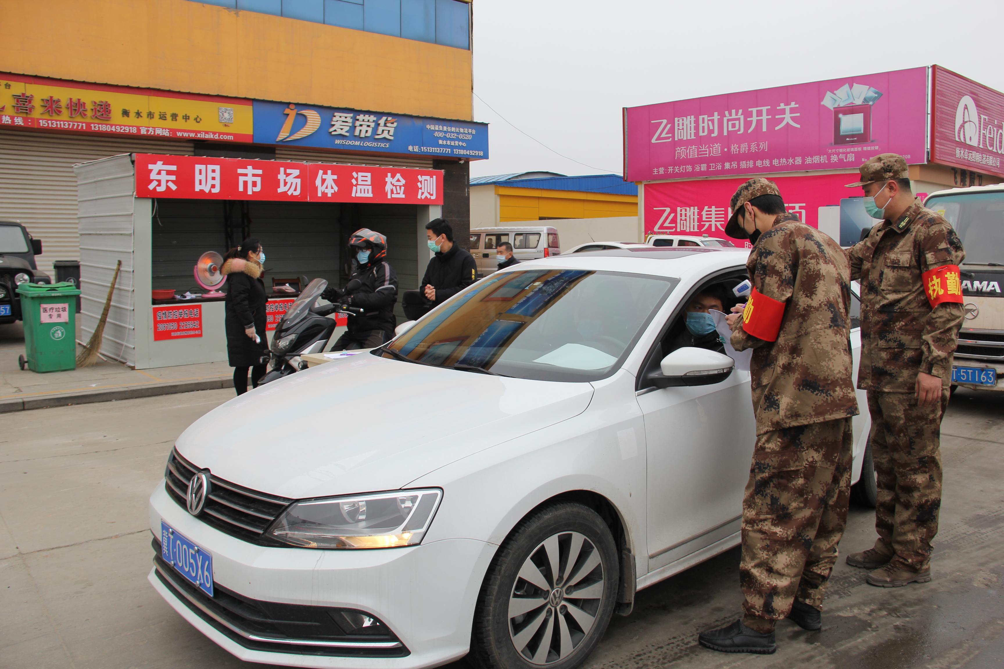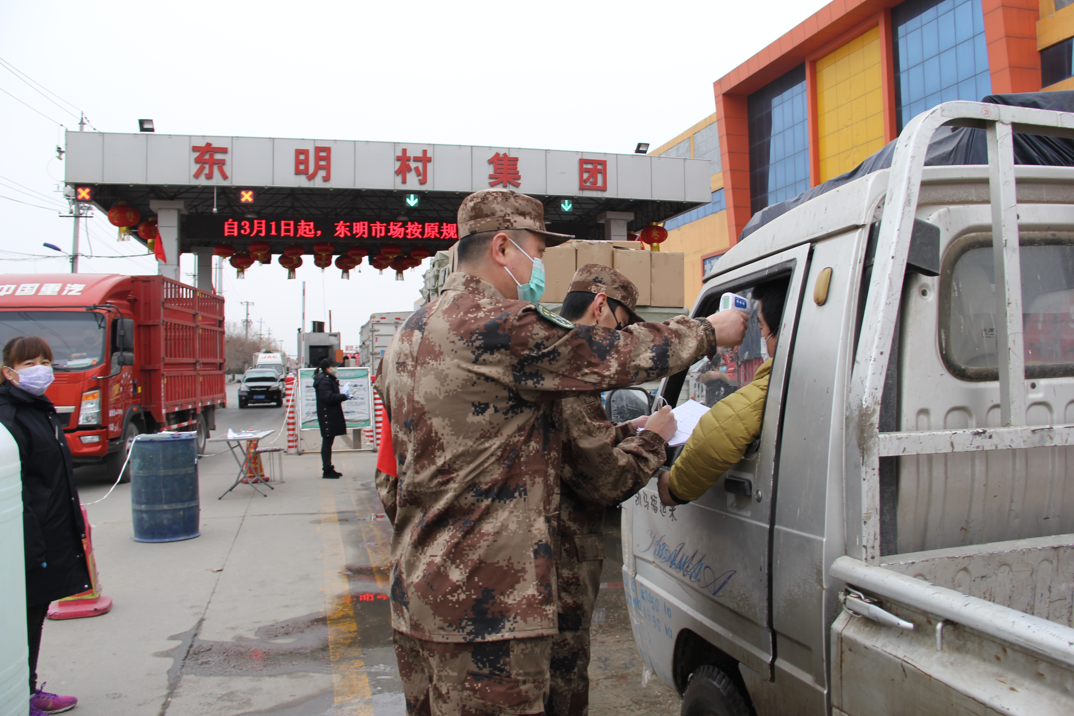 “您好!请接受体温检测!”日前,河东街道东明村物流园部分企业开始复工,在河东街道东明村集团物流园执法检查站3名民兵党员和工作人员共同把守物流园首道防线,认真检测所有出入人员体温并对随行车辆进行洗消。