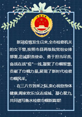 新冠疫情发生以来,全市检察机关的女干警忠诚职责使命、勇于担当尽责,奋战在战“疫”一线,凝聚了巾帼智慧,贡献了巾帼力量,展现了新时代检察巾帼风采。在今年三八节衷心祝大家:身体健康、阖家欢乐!众志成城、凝心聚力,共同谱写衡水检察巾帼新篇章!