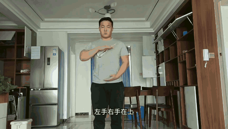 双手一上一下。上方手掌置于胸骨位置,并与胸骨垂直;下方手掌置于耻骨位置,并与耻骨垂直。