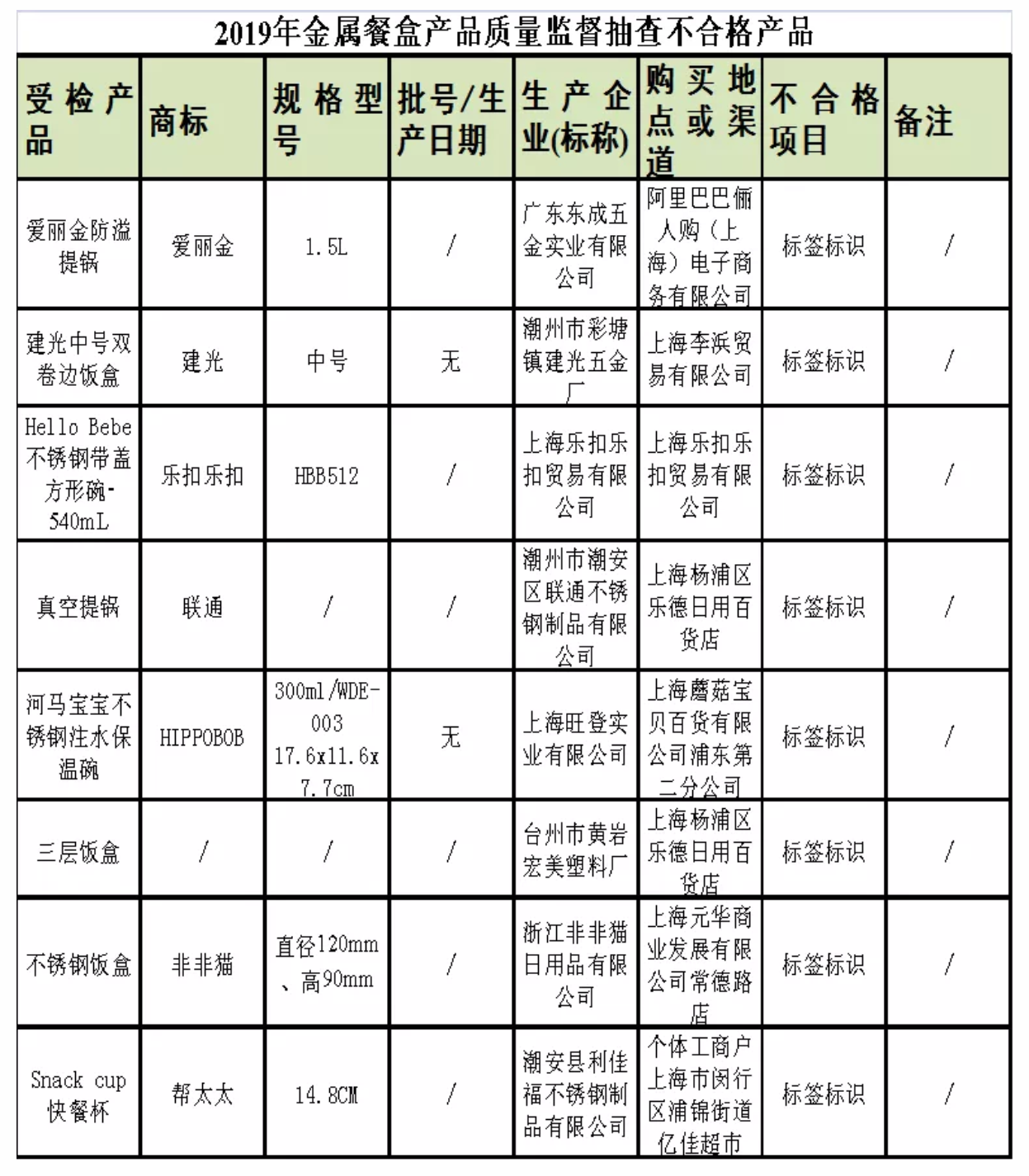 据上海市监管局介绍,18批次产品涉及不合格项目为标签标识。其中,8批不合格金属餐盒中,都存在“未标注生产日期”的情况,5批次的不合格产品“标注作废标准”,4批次的不合格产品“未标注材料成分”。不合格金属餐盒涉及的品牌有爱丽金、建光、乐扣乐扣等。