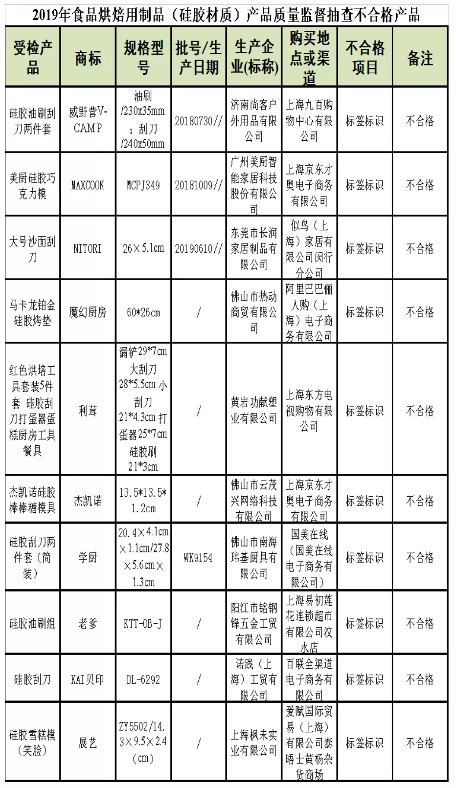 此外,10批次不合格食品烘焙用制品(硅胶材质)中,7批次的不合格产品“未标注生产日期”,2批次的不合格产品“标注作废标准”,1批次的产品“无中文标签”。不合格产品包括硅胶油刷刮刀两件套、美厨硅胶巧克力模、马卡龙铂金硅胶烤垫等。其中,威野营V-CAMP、MAXCOOK、NITORI等品牌上榜。
