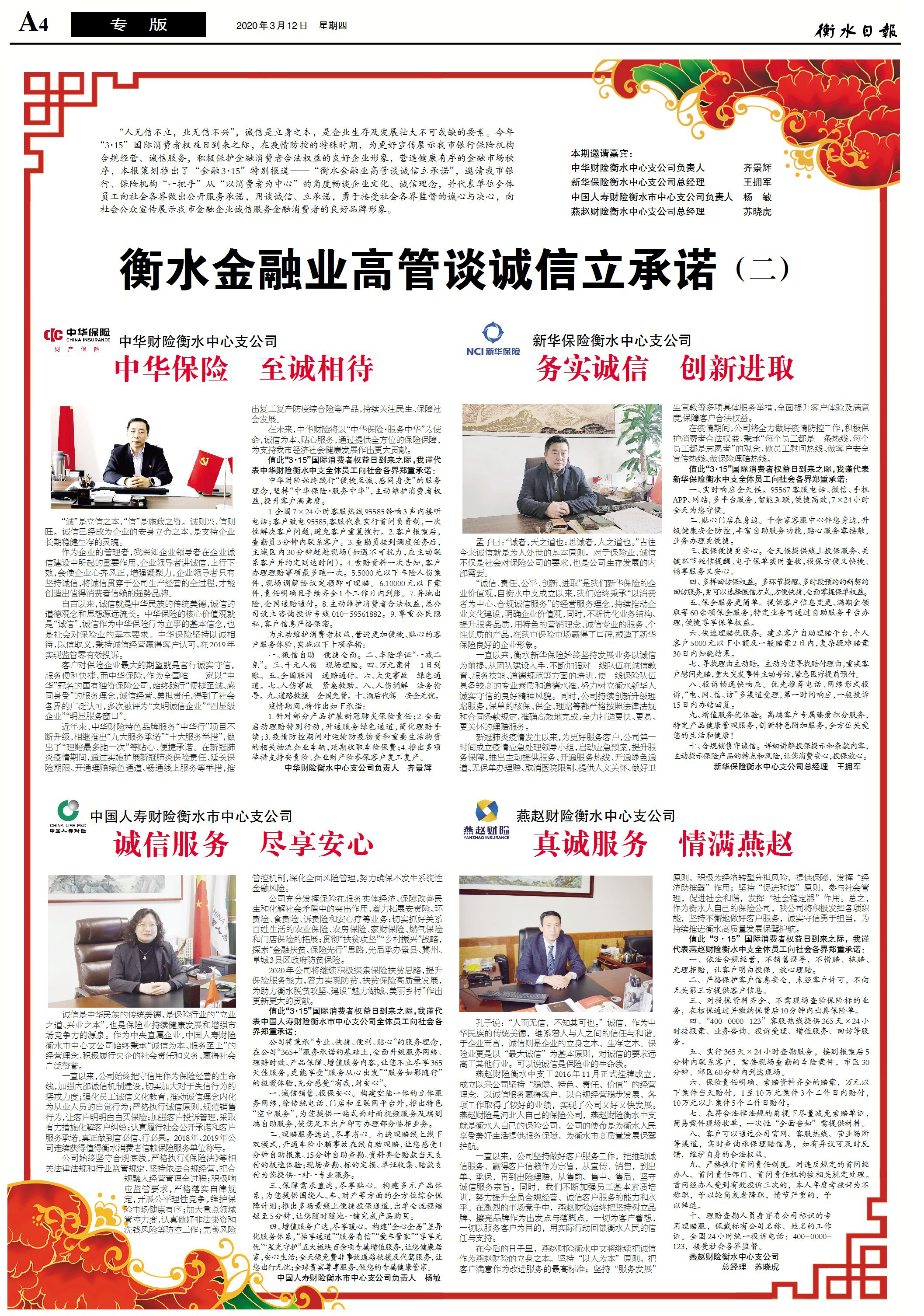 值此“3·15”国际消费者权益日到来之际,我谨代表中国人寿财险衡水市中心支公司全体员工向社会各界郑重承诺: