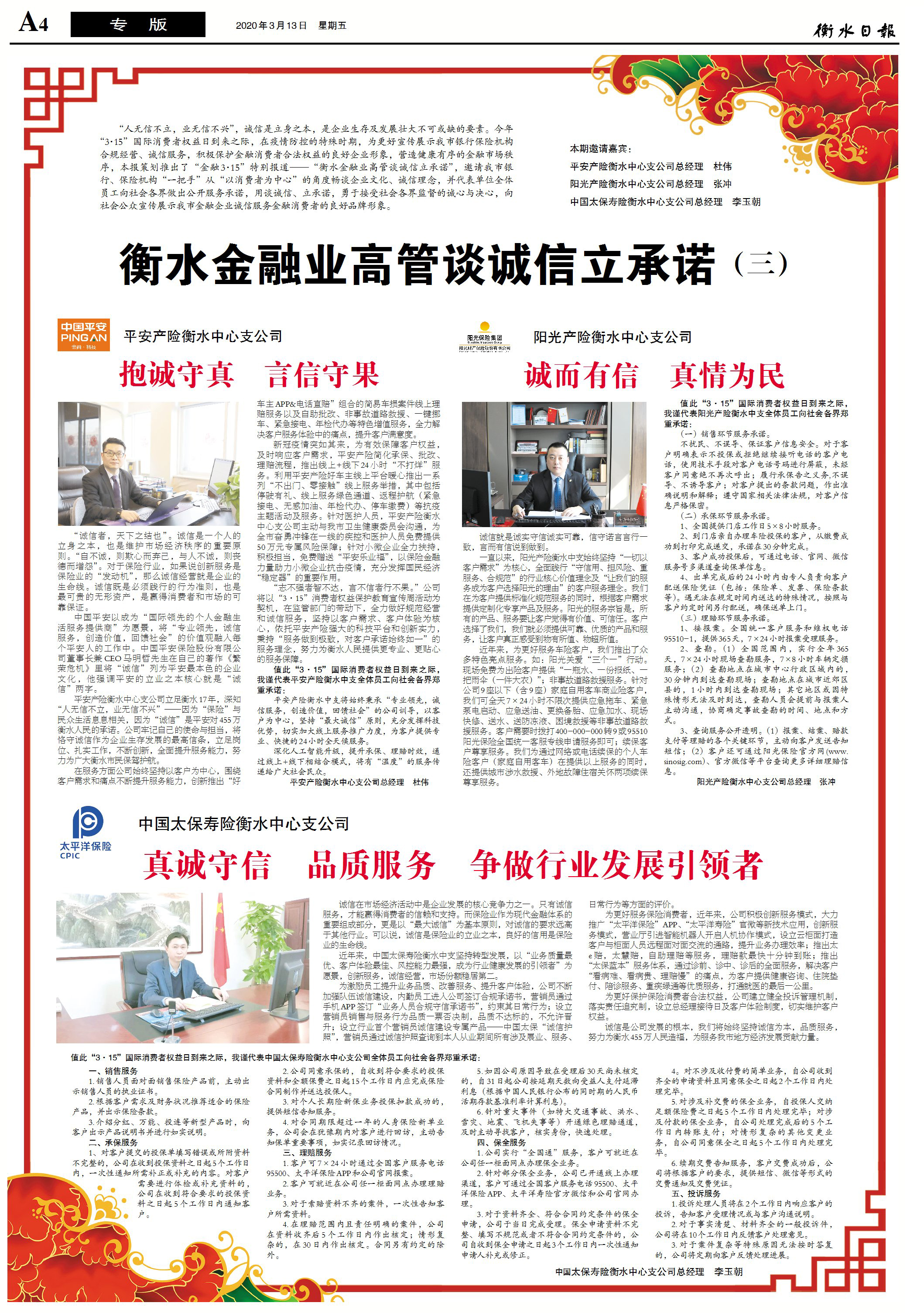 值此“3·15”国际消费者权益日到来之际,我谨代表中国太保寿险衡水中心支公司全体员工向社会各界郑重承诺: