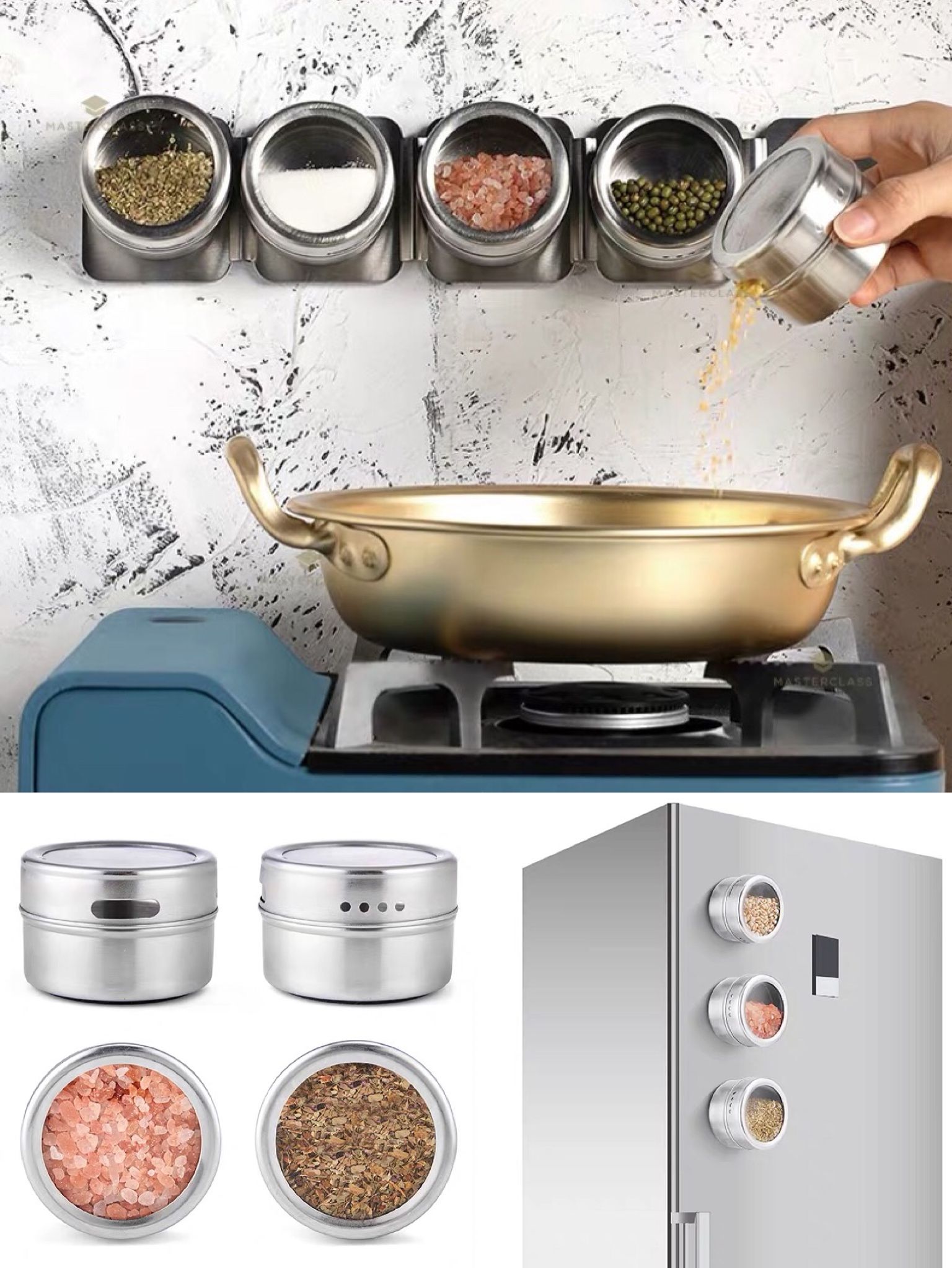 完全不占用台面空间,你可以让它们上墙,或是吸附在冰箱门、油烟机上,既方便取拿,而且比起传统的放置方法,更加一目了然,各色的调味料几乎成了天然的厨房装饰品。调料孔设置大小不同,适合各调料盛放,出料也很均匀。