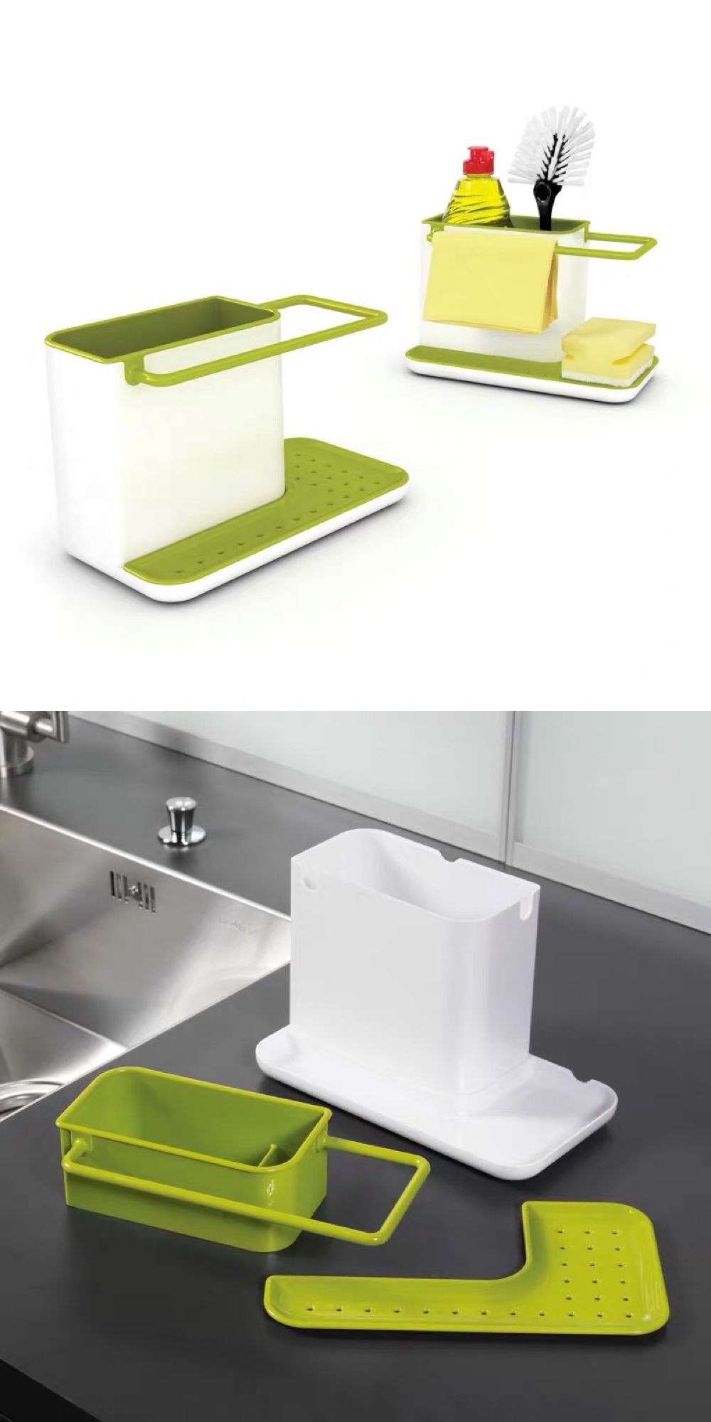 干净整洁的厨房离不开清洁,洗碗液、刷子、百洁布的收纳,用JOSEPH JOSEPH沥水储物架就可以搞定。横杆可以用来晾挂抹布,主体部分的小桶可以放置洗碗液、刷子,底部有排水板设计,可以放置洗碗海绵。储物架还可以方便拆卸,并适用洗碗机清洗。