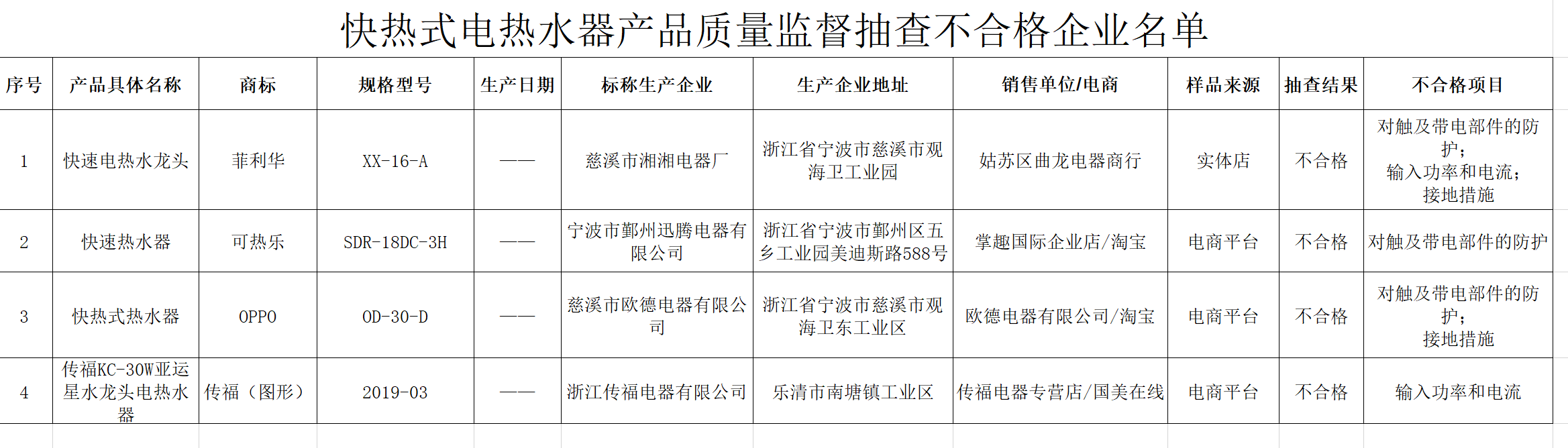 新京报记者发现,在3月17日公布的4批次不合格产品名单中,有3批次样品来源于电商平台,1批次来自实体店。主要不合格项目为对触及带电部件的防护、输入功率和电流、接地措施。其中,1批次商标为可热乐快速热水器不合格,规格型号为SDR-18DC-3H,电商为掌趣国际企业店/淘宝。1批次商标为OPPO快热式热水器不合格,规格型号为OD-30-D,电商为欧德电器有限公司/淘宝。1批次商标为传福(图形)的传福KC-30W亚运星水龙头电热水器不合格,规格型号为2019-03,电商为传福电器专营店/国美在线。