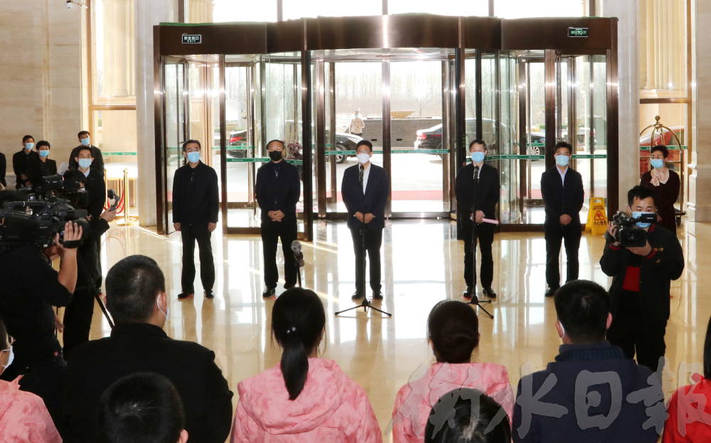 王景武说,在全国抗击新冠肺炎疫情的关键时刻,大家积极响应习近平总书记和党中央号召,不畏艰难、冲锋在前,在抗击疫情的最前线,同时间赛跑、与病魔较量,为坚决打赢湖北保卫战、武汉保卫战作出了衡水贡献,充分体现了医者仁心、大爱无疆的崇高精神,体现了新时代衡水青年的责任担当。支援湖北期间,你们当中涌现出许多可歌可泣的先进事迹和先进典型,先后有17名同志光荣入党,以实际行动践行初心使命、讲好衡水故事,发挥了火线上的中流砥柱作用,彰显了大儒之乡、道德高地的独特风采,凝结成了一笔无比宝贵的精神财富,不愧为衡水人民的骄傲,是全市广大干部群众学习的楷模。希望大家认真梳理总结抗疫工作中的先进经验,把科学防控知识传达给身边同事、亲朋好友,进一步弘扬社会主义核心价值观,传播社会正能量,为取得抗击疫情的全面胜利营造良好氛围。