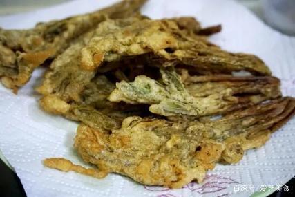 5、等油温烧到大概六成热,香椿芽下锅,用小火炸大约5秒之后用筷子翻动一下,炸另一面,大概15秒左右就可以出锅了。把刚出锅的香椿芽放在吸油纸上,滤掉多余的油(主要是怕吃起来会腻),一盘色香味俱全的特色小吃便做好了。