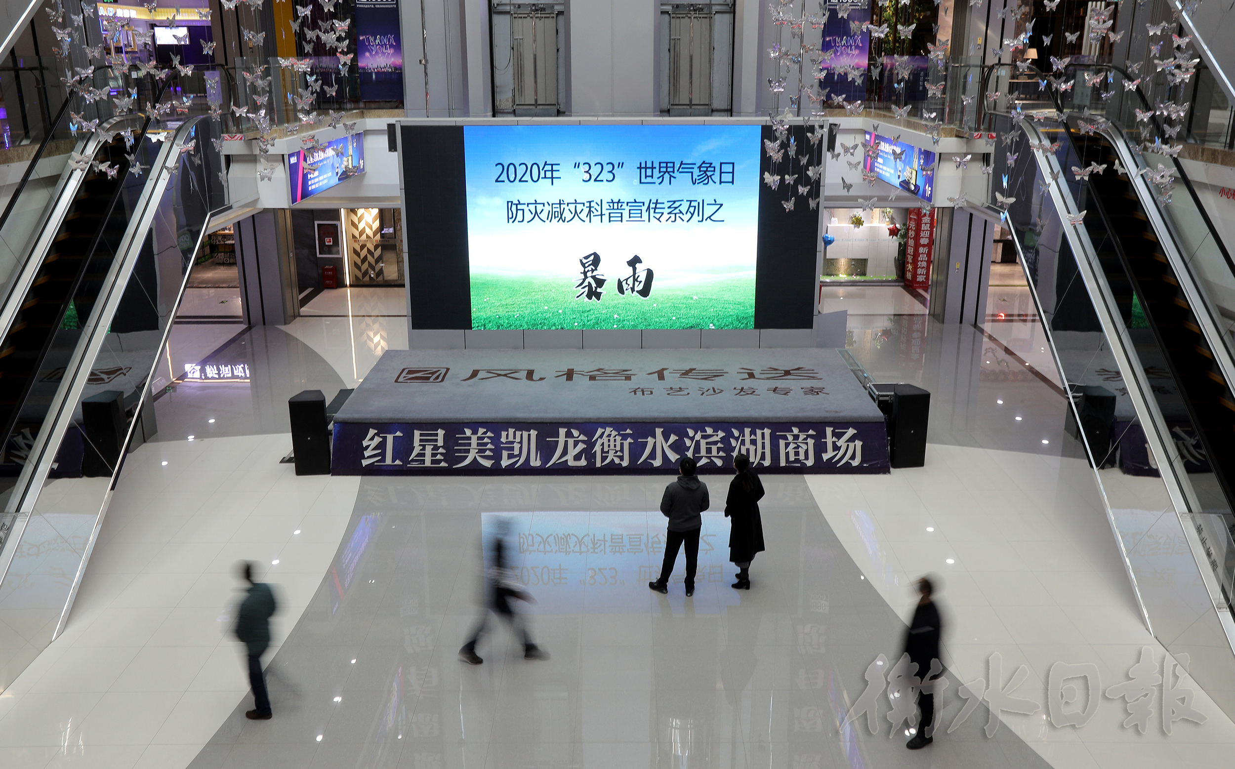 3月22日,在红星美凯龙衡水滨湖商场,市民驻足观看防灾减灾科普宣传视频。