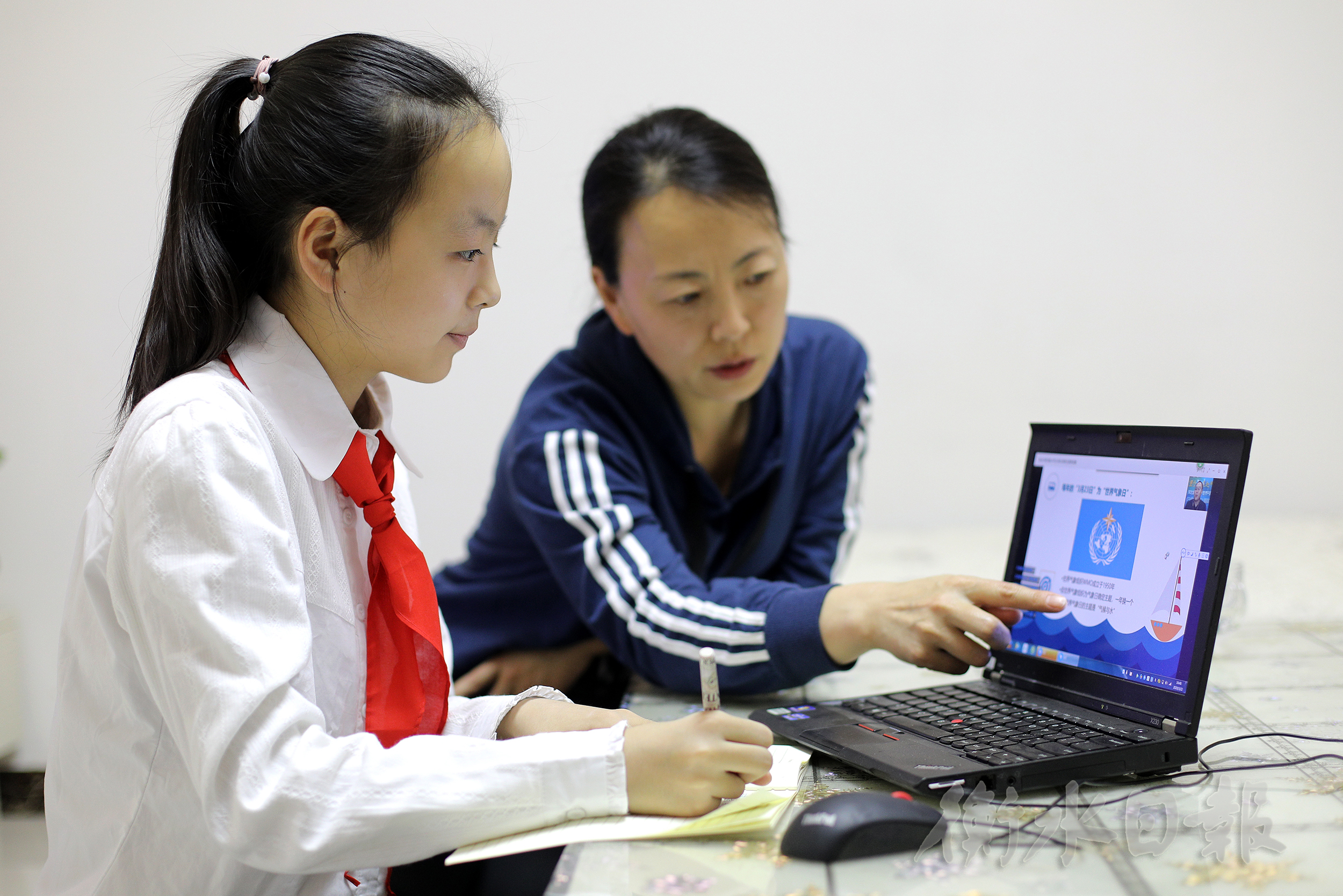 3月22日,衡水市裕华路小学五年级一班的尹程萱在妈妈辅导下通过直播直播认真学习气象知识。
