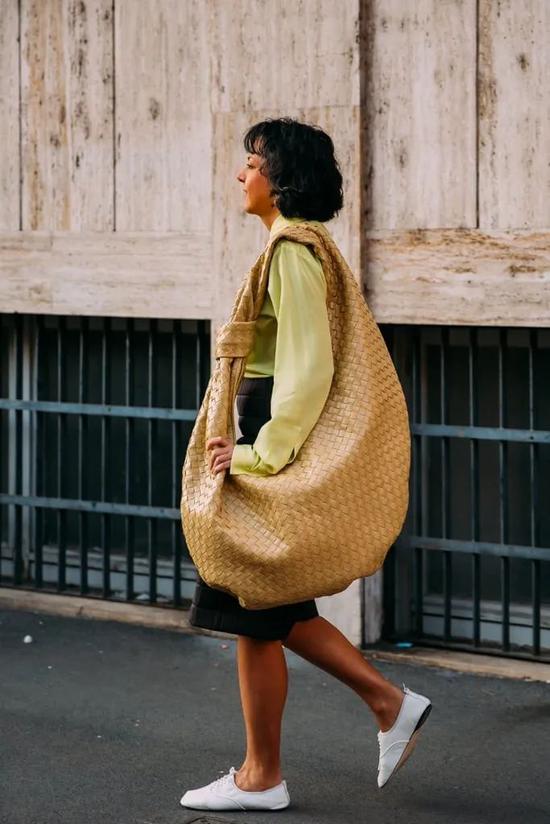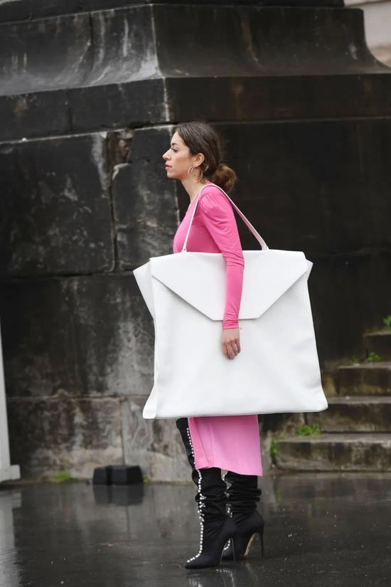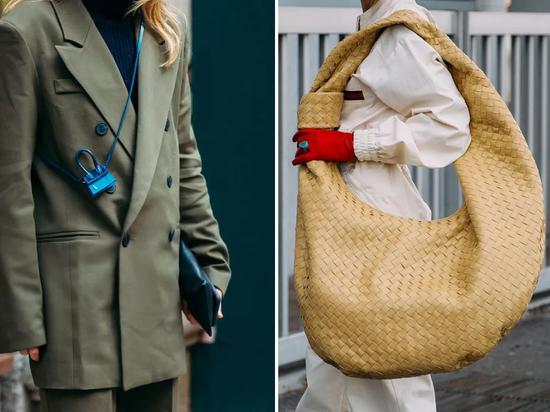 这一季的时装周秀场外,博主们手上的包包都肉眼可见地变大了,要知道小包在时尚界火了可不止一两季了,设计师们都在做,甚至还出了左图这种小到让圈外人满脑袋问号的Size。然后呢,物极必反,今年的包款开始集体反弹——从小到不能再小之,变成大到不能再大,没错,时尚圈真的很疯。