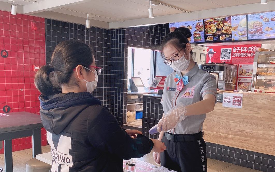 现在,肯德基餐厅已经开放堂食,樊勃高兴地看到,顾客一天比一天多了起来。她说:“我们有严格的防疫措施,员工每天测量体温,严格执行各项消毒制度。每一位来就餐的顾客都要测体温,并登记个人信息。我们专门在柜台前设立了取餐处,顾客不能靠近柜台,可以手机自助下单后到取餐处取餐,以保证每一份餐食都安全卫生,就餐的顾客也会尽量隔开距离坐,顾客们可以放心来我们餐厅就餐。”