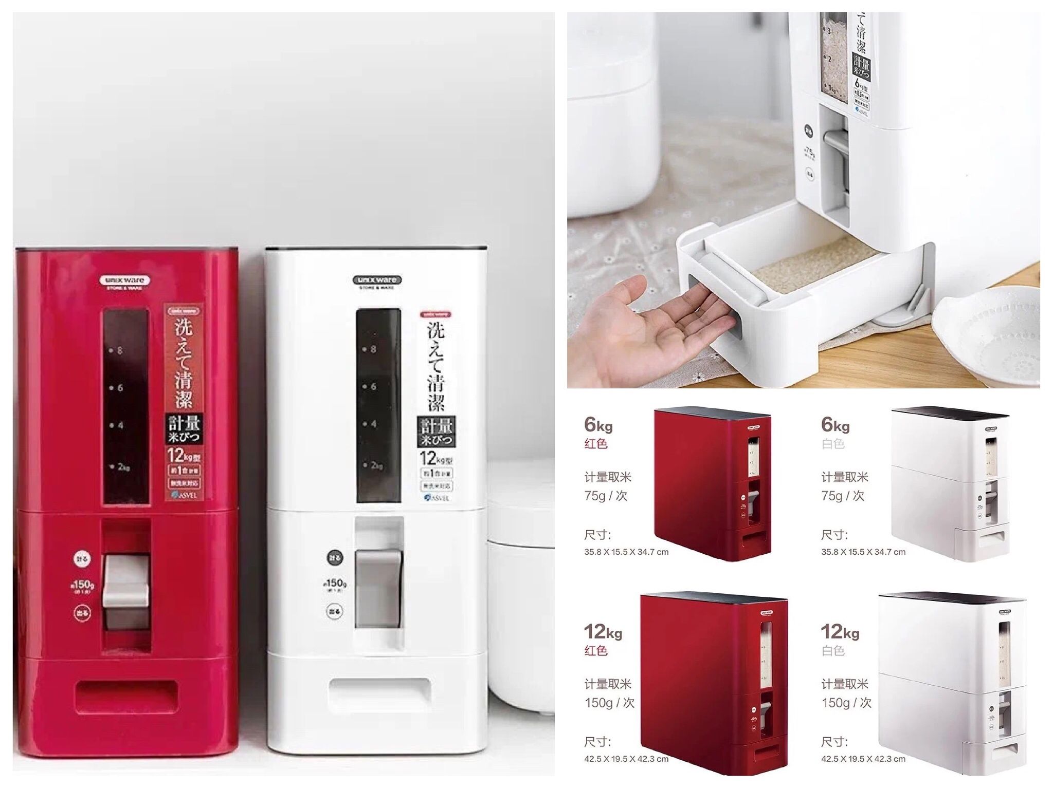来自日本的ASVEL计量式米桶,采用抽屉式取米盒,防护密封盖能有效防尘防虫,漏斗式米仓让取用时不留陈米。而且每次按压时的出米量可以精确到“克”,帮助“煮夫煮妇”们轻松控制取量。