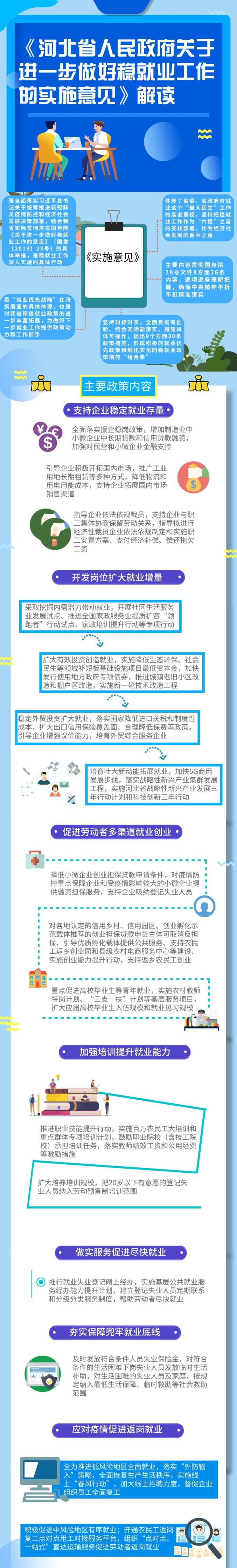 日前,河北省政府办公厅印发《关于进一步做好稳就业工作的实施意见》(以下简称《实施意见》)。《实施意见》提出,把稳就业作为重中之重,坚持就业政策与经济政策联动,坚持创造岗位和稳定岗位并重,突出重点、统筹推进、精准施策,全力防范化解规模性失业风险,全力确保就业大局稳定。