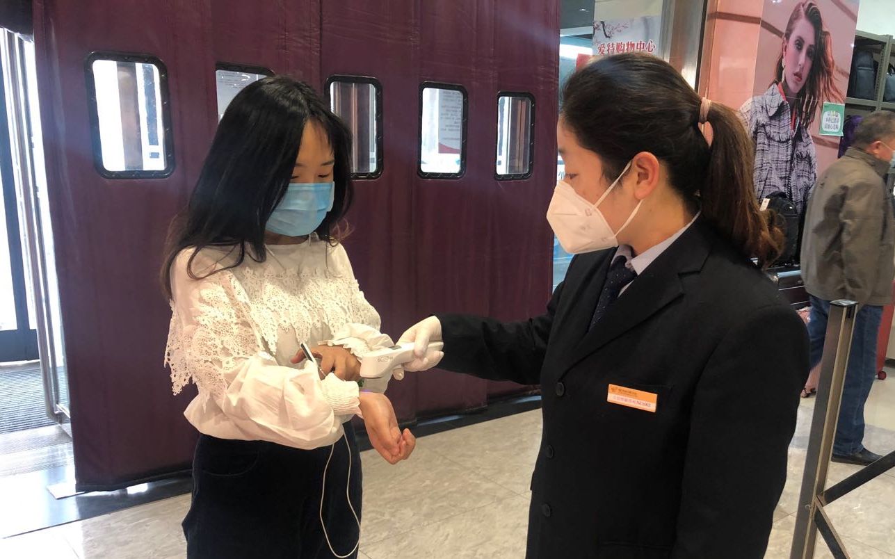 在超市入口处,工作人员正对每一位进超市的顾客测量体温,体温合格后方可进入超市。据超市经理王经理介绍,目前,针对疫情防控,他们没有丝毫松懈,每天上班前,对所有工作人员测量体温,体温异常者不得上岗。营业后,对进入超市的每位顾客测量体温,没戴口罩的顾客,予以劝离。在对超市定时消毒的同时,对服务台、收银台、购物车等顾客经常聚集和接触的地方及物品,采取实时消毒,确保顾客安全。