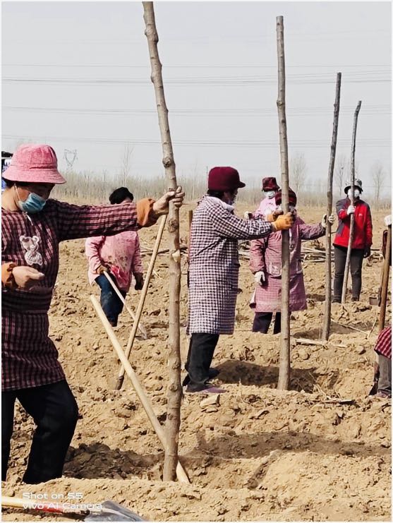 开沟、种苗、填土……不误农时不负春,朝前铺村村南望去,十几位村民正有序地种植栾树。