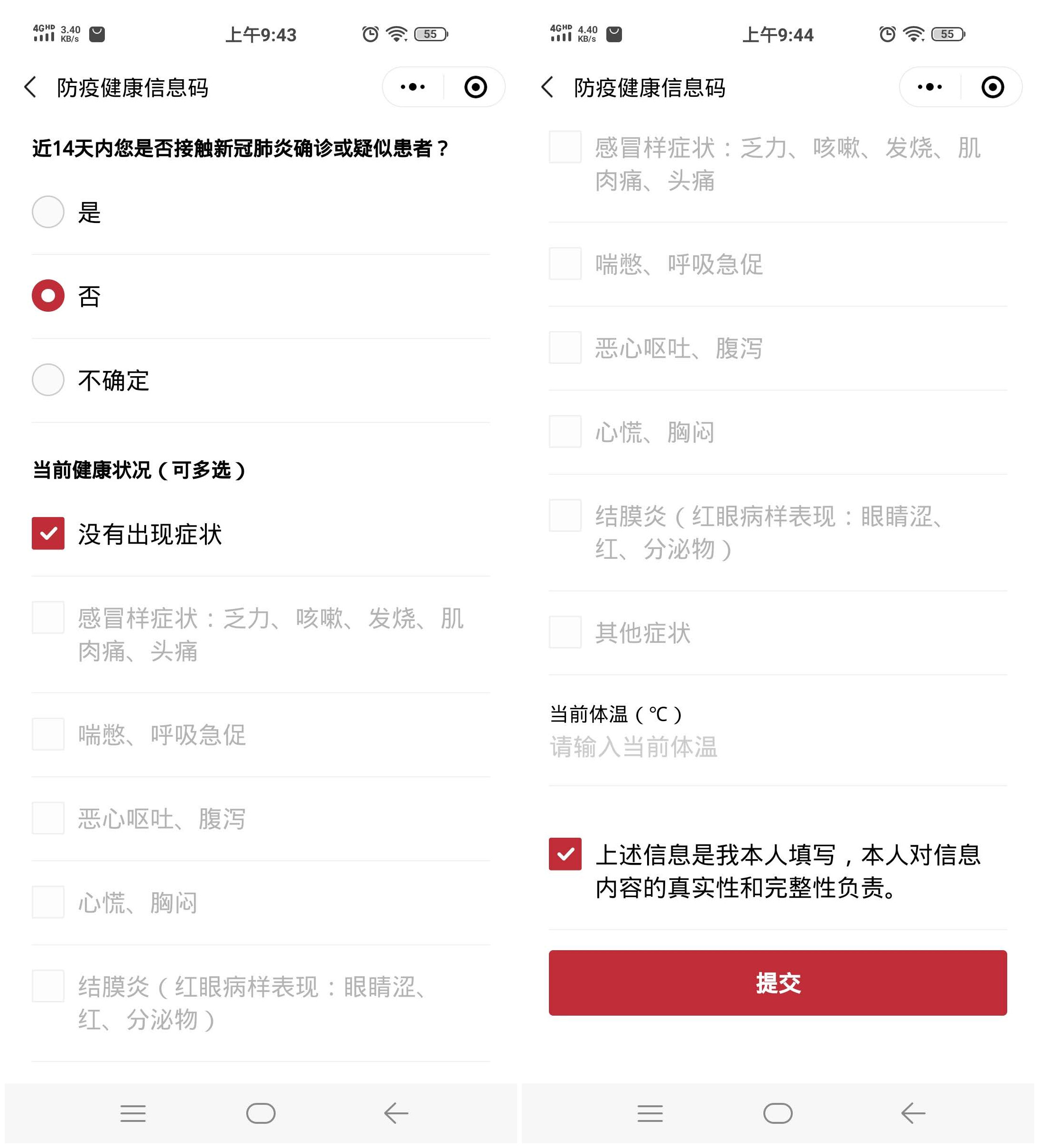 目前,我省“健康通行码”按用途分为“出示码”和“扫描码”两种,依据个人防疫健康风险分级,分为红、黄、绿三种颜色,供各类机关、企事业单位和疫情防控卡口使用。按规定,“红码”和“黄码”人员不能通行,且应按照疫情防控部门要求进行医学诊疗或观察;“绿码”人员体温正常的可予以通行。比如,市民在准备进入超市时,可通过“出示码”功能,在超市入口向工作人员展示自己的健康状况;同时,超市工作人员可通过“扫描码”功能,获取每一位顾客的防疫健康信息,快速判断顾客是否符合出入要求。