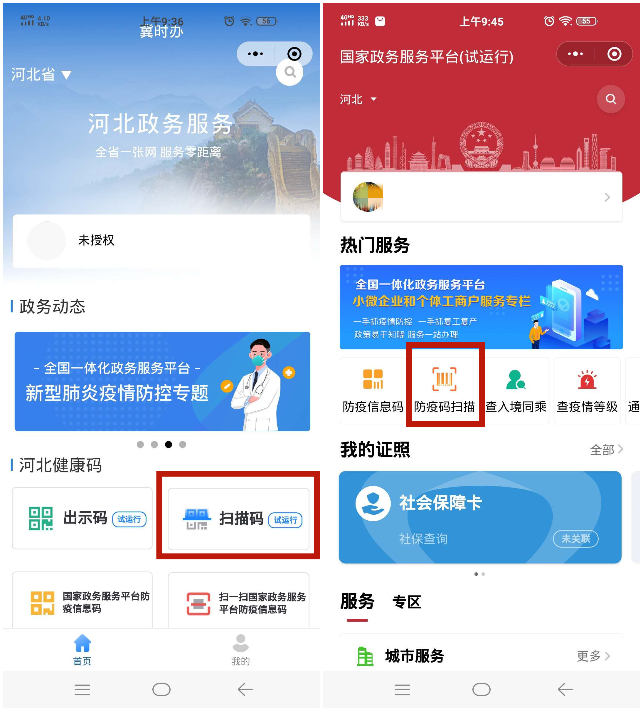 使用“扫描码”的具体步骤为:打开微信/支付宝,搜索“冀时办”-选择“冀时办”小程序,按提示进行授权登录-点击“河北通行码”栏目下的“扫描码”-跳转到“国家政务服务平台”小程序登录授权-点击“热门服务”下的“防疫码扫描”-扫描他人出示的健康通行码—系统即显示该人员健康通行码信息。