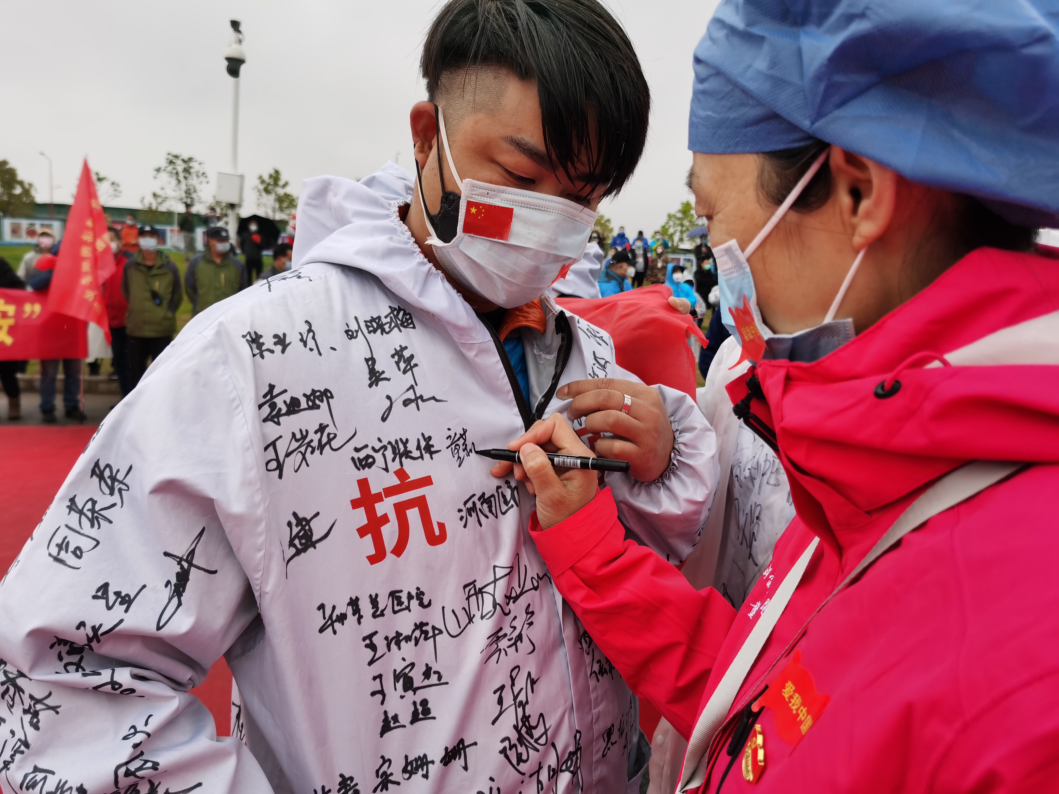 “大家都很激动,在我们的共同努力下,支援雷神山医院的任务终于告捷!”童莉坦言,支援期间,衡水的每一位医疗队员都展示出了在护理工作中的高素质,作为组长,她多年的管理经验也发挥了很大的作用。同时,每个人都有很大的收获和进步,“业务能力提升,也收获了友情。”当日下午,队员们在雷神山医院外举行封舱活动,大家一边兴奋地唱着歌曲,一边呼喊着庆祝这个胜利的时刻。雷神山医院外面,尽管细雨朦朦,却丝毫抵挡不住大家胜利的喜悦和兴奋的心情,大家拉着红色的条幅“祝福凯旋平安”“致敬白衣天使凯旋”。现场,许多雷神山医院的武汉志愿者,邀请医疗队员们在自己的志愿服上签下名字,留作纪念。