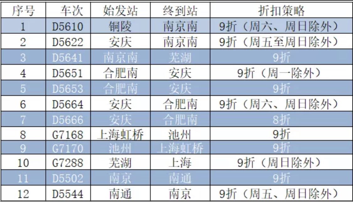 据上海发布消息,上海铁路局介绍,4月1日起至6月30日,对G1768(上海虹桥-池州)、G7170(池州-上海虹桥)、G7288(芜湖-上海)等12趟动车组列车在宁安城际、宁启线试行浮动票价,最多可享受8折优惠。